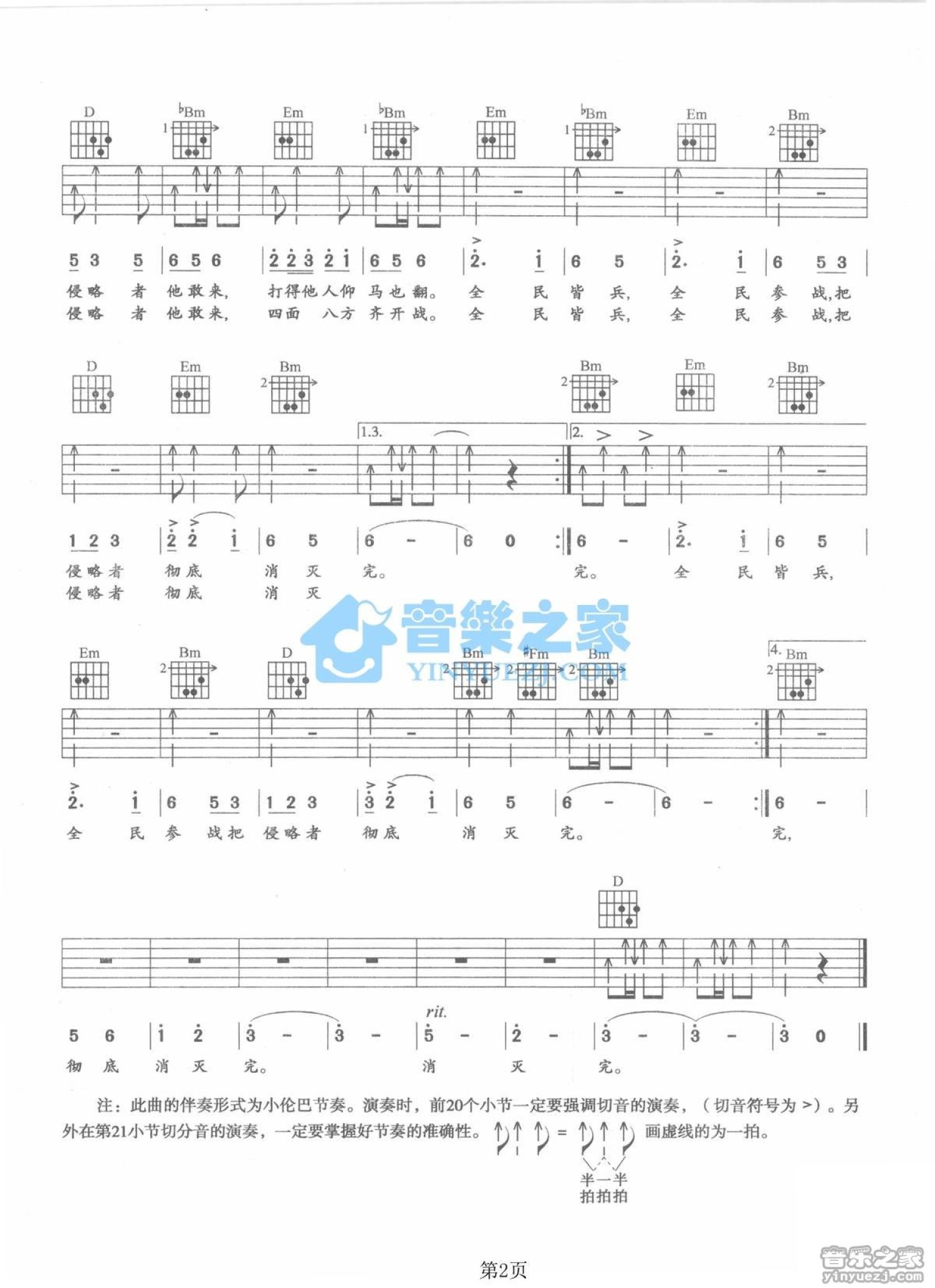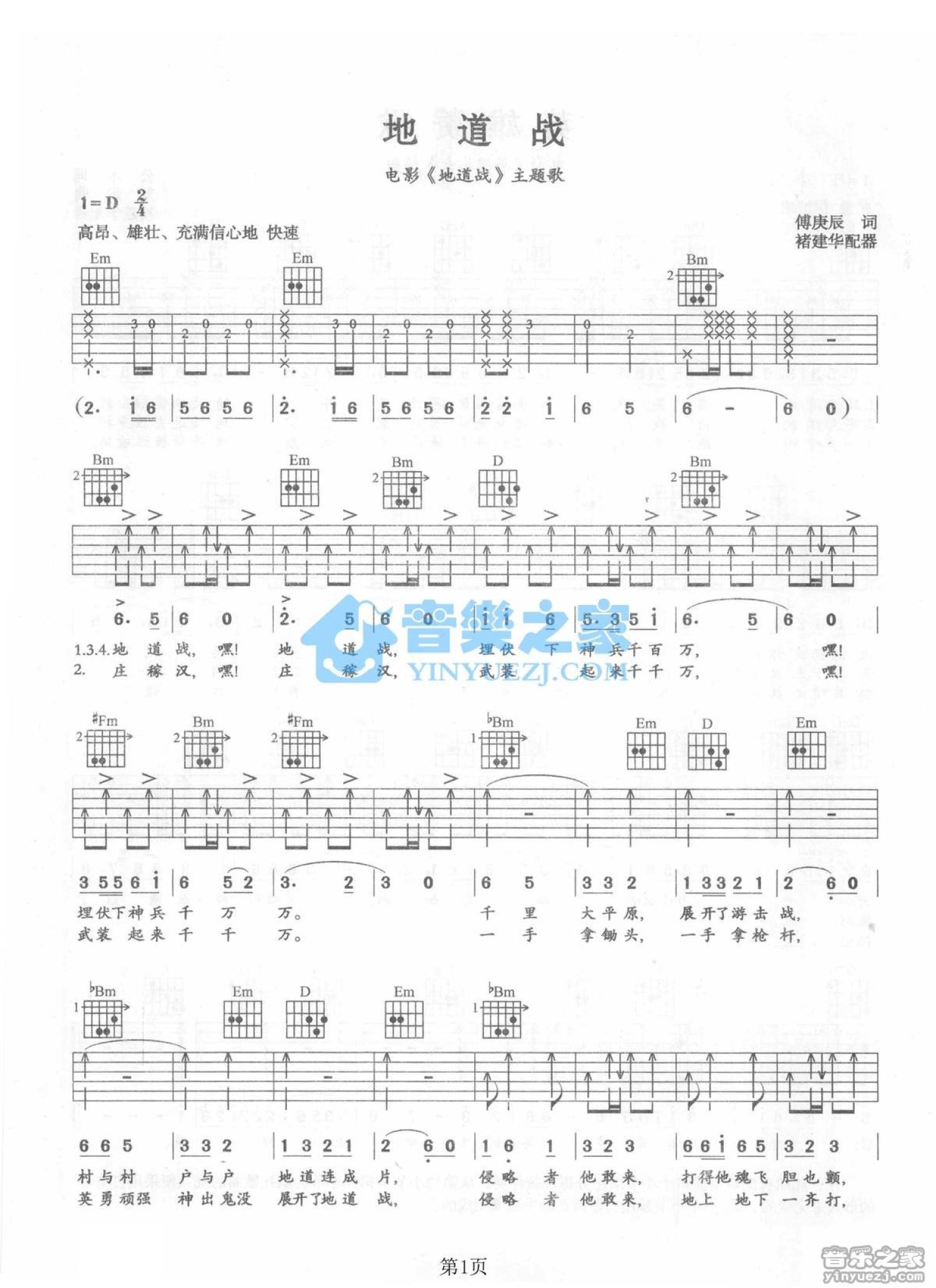 曲谱介绍: D调版 《地道战》吉他弹唱六线谱