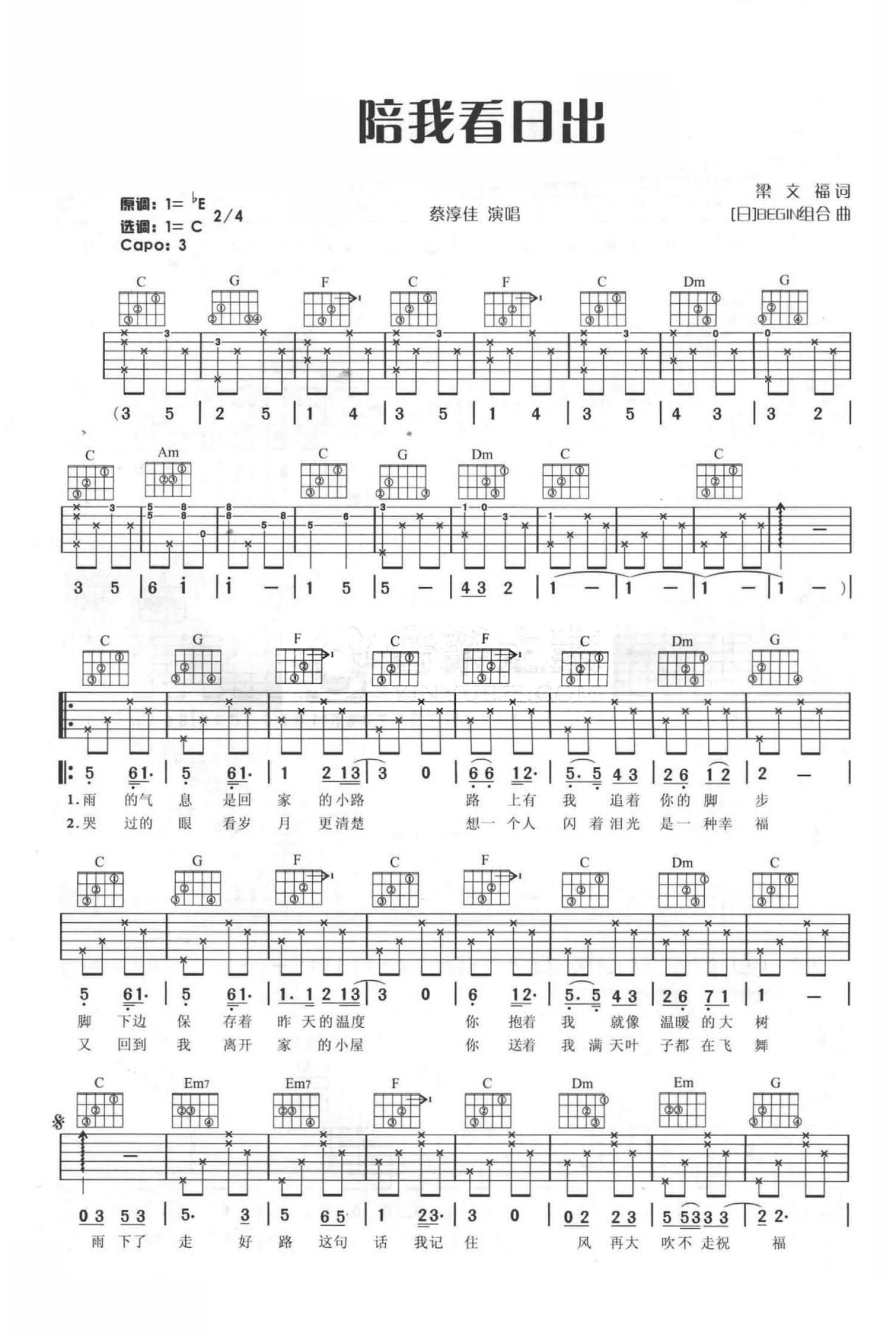 曲谱介绍: C调简单版蔡淳佳《陪我看日出》吉他弹唱六线谱