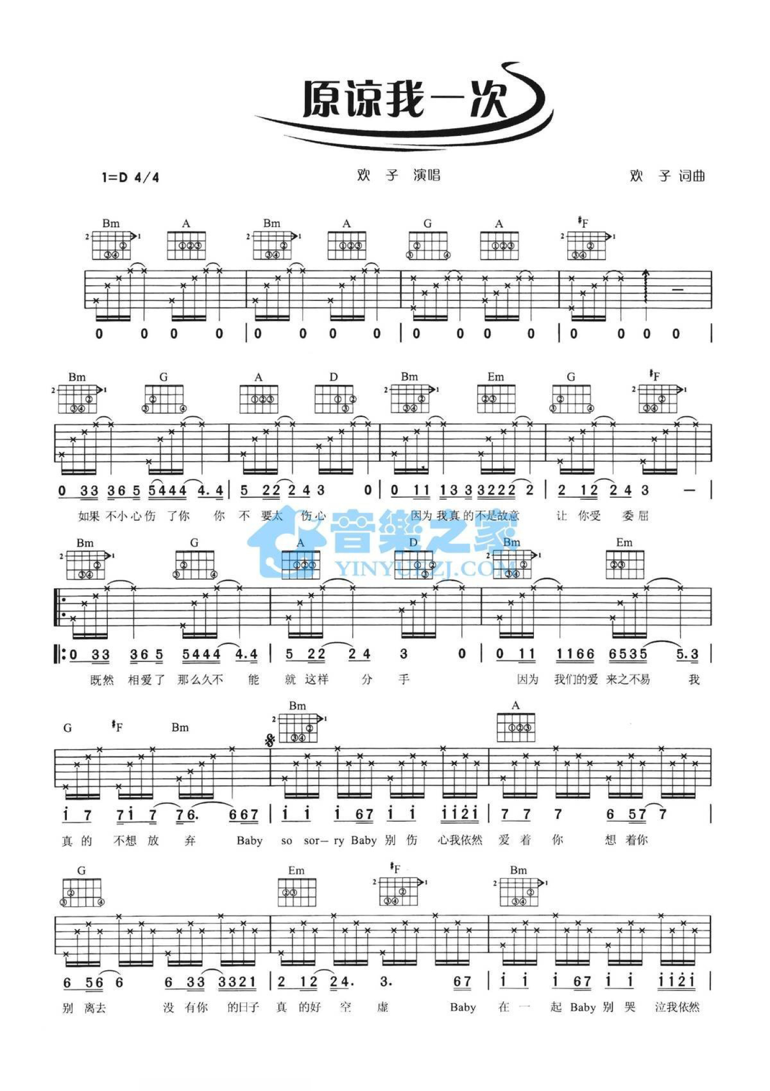 原谅我一次吉他谱 - 欢子 - D调吉他弹唱谱