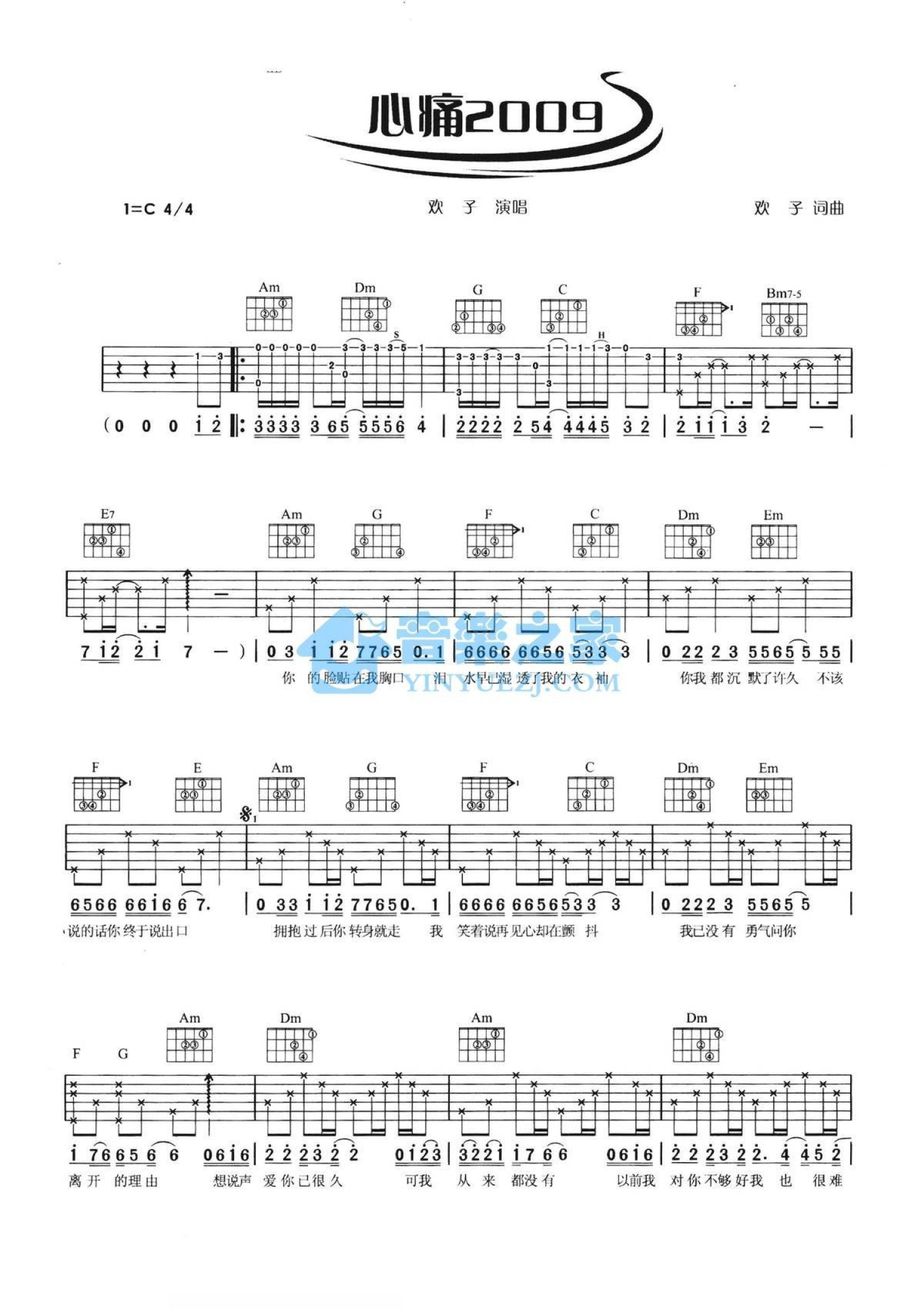 曲谱介绍: C调版《心痛2009》吉他弹唱六线谱