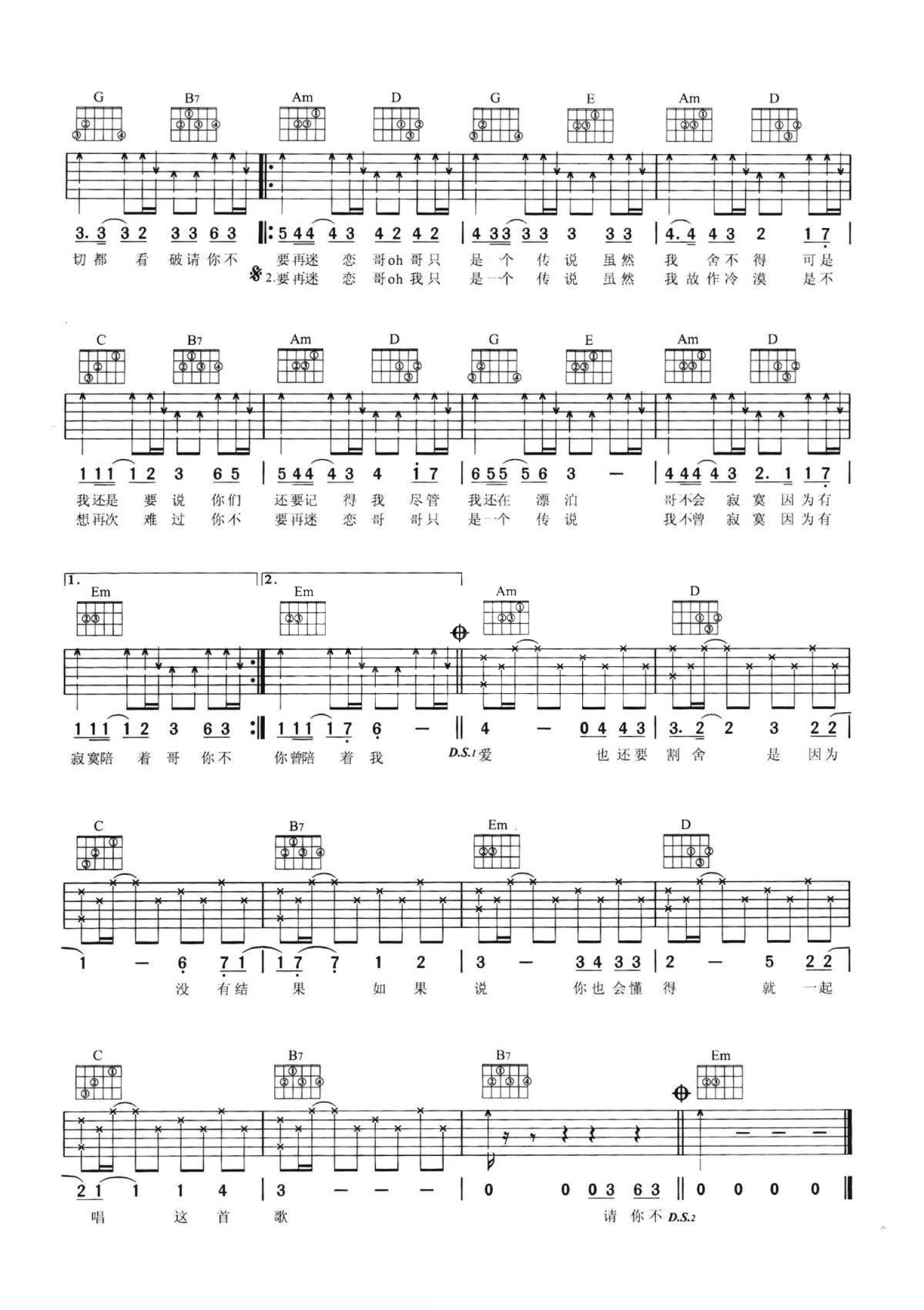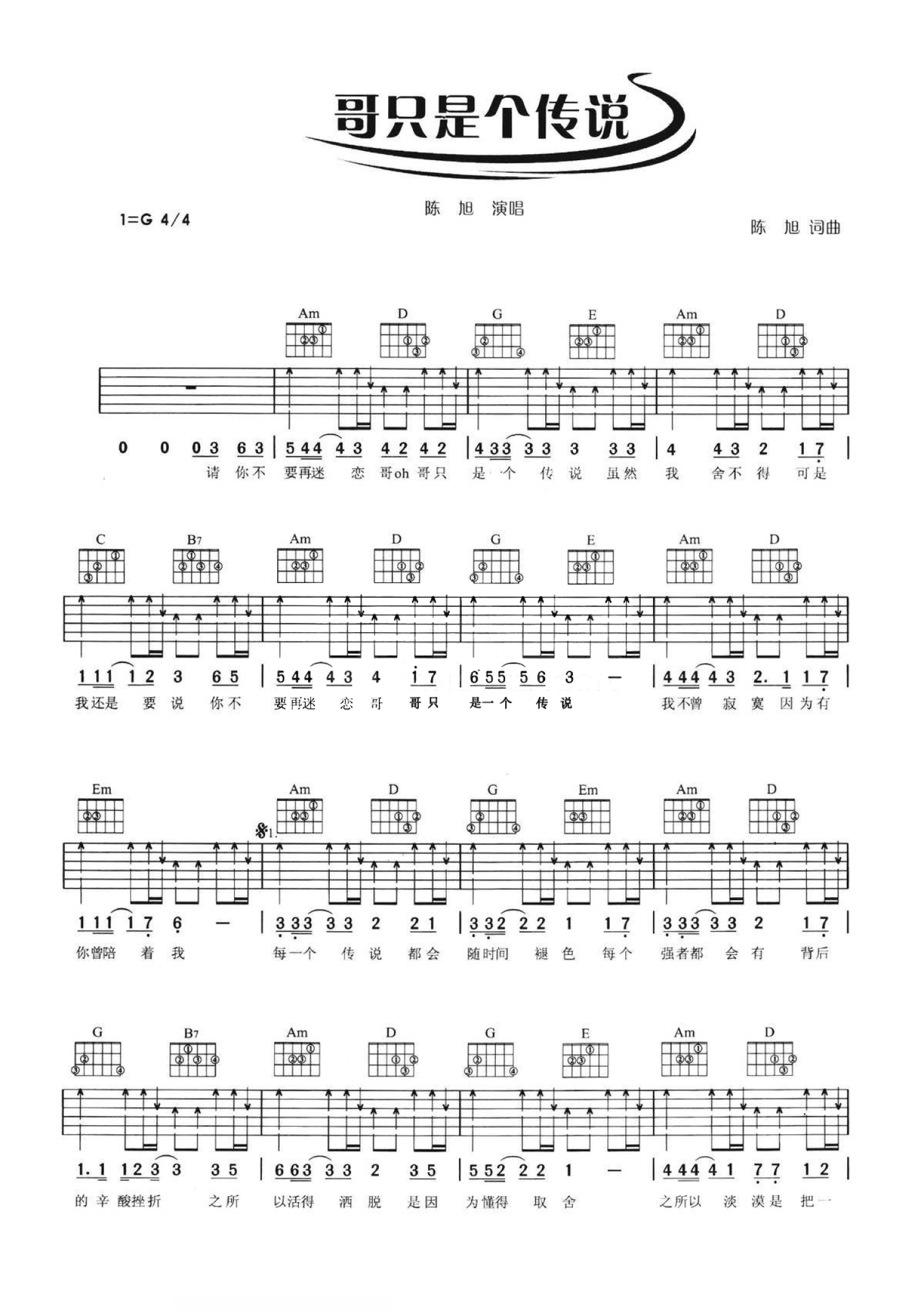 曲谱介绍: G调版陈旭《哥只是个传说》吉他弹唱六线谱