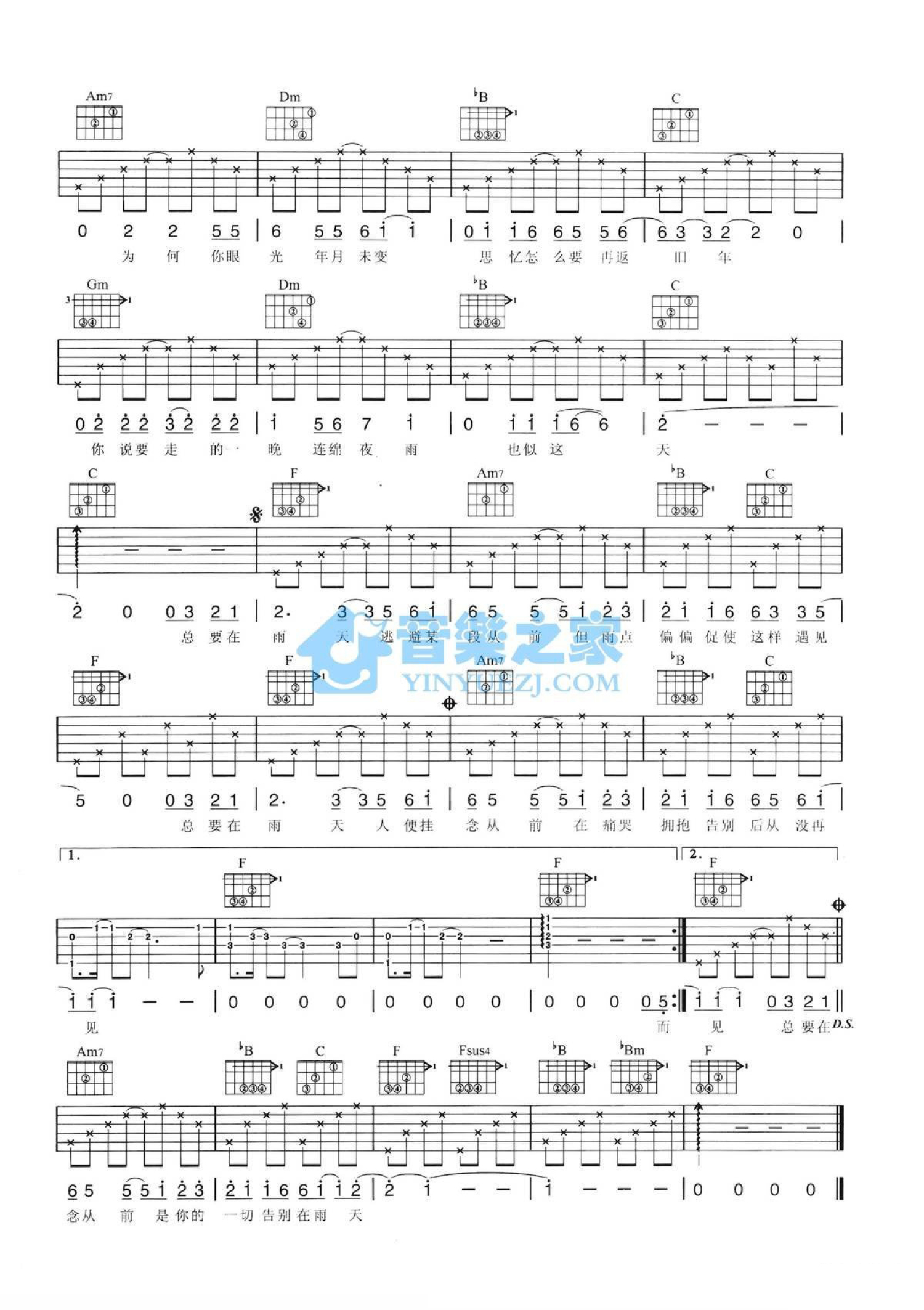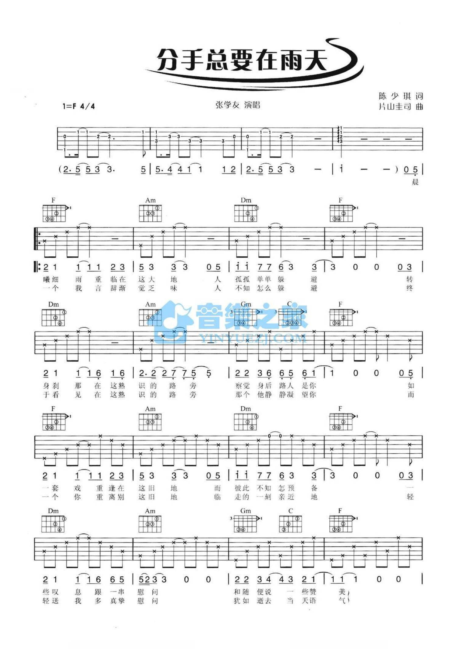 曲谱介绍: F调版《分手总要在雨天》吉他弹唱六线谱