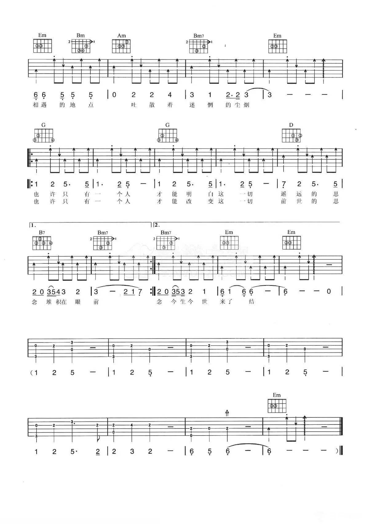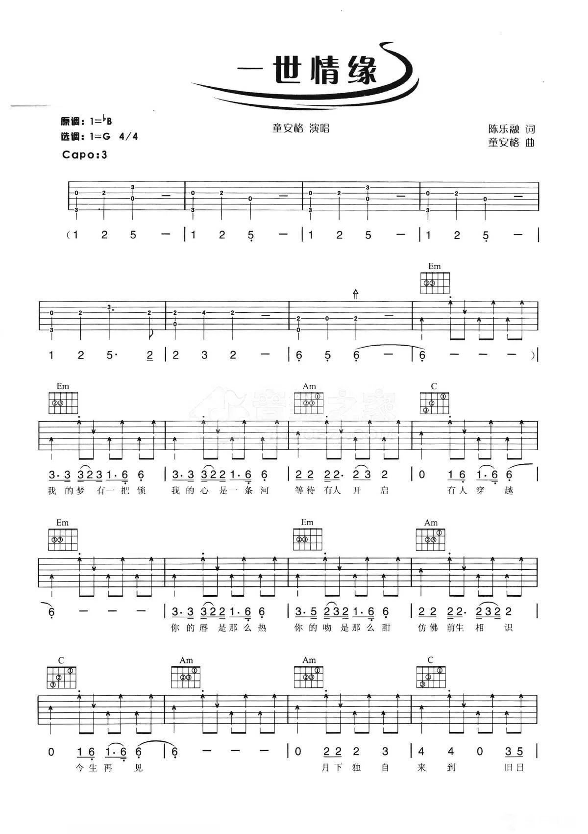 曲谱介绍: G调版童安格《一世情缘》吉他弹唱六线谱