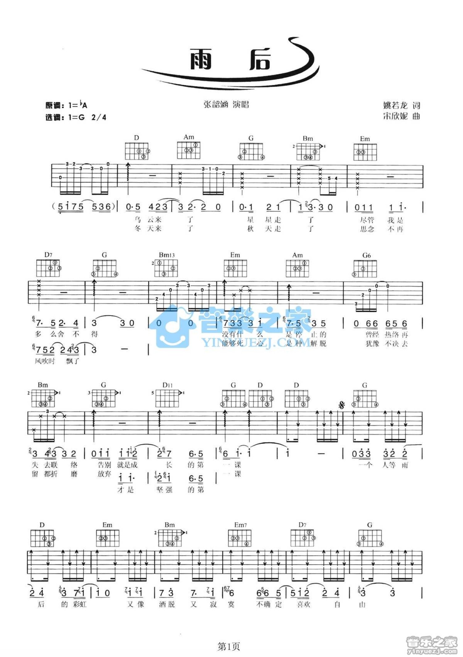 曲谱介绍: G调版《雨后》吉他弹唱六线谱