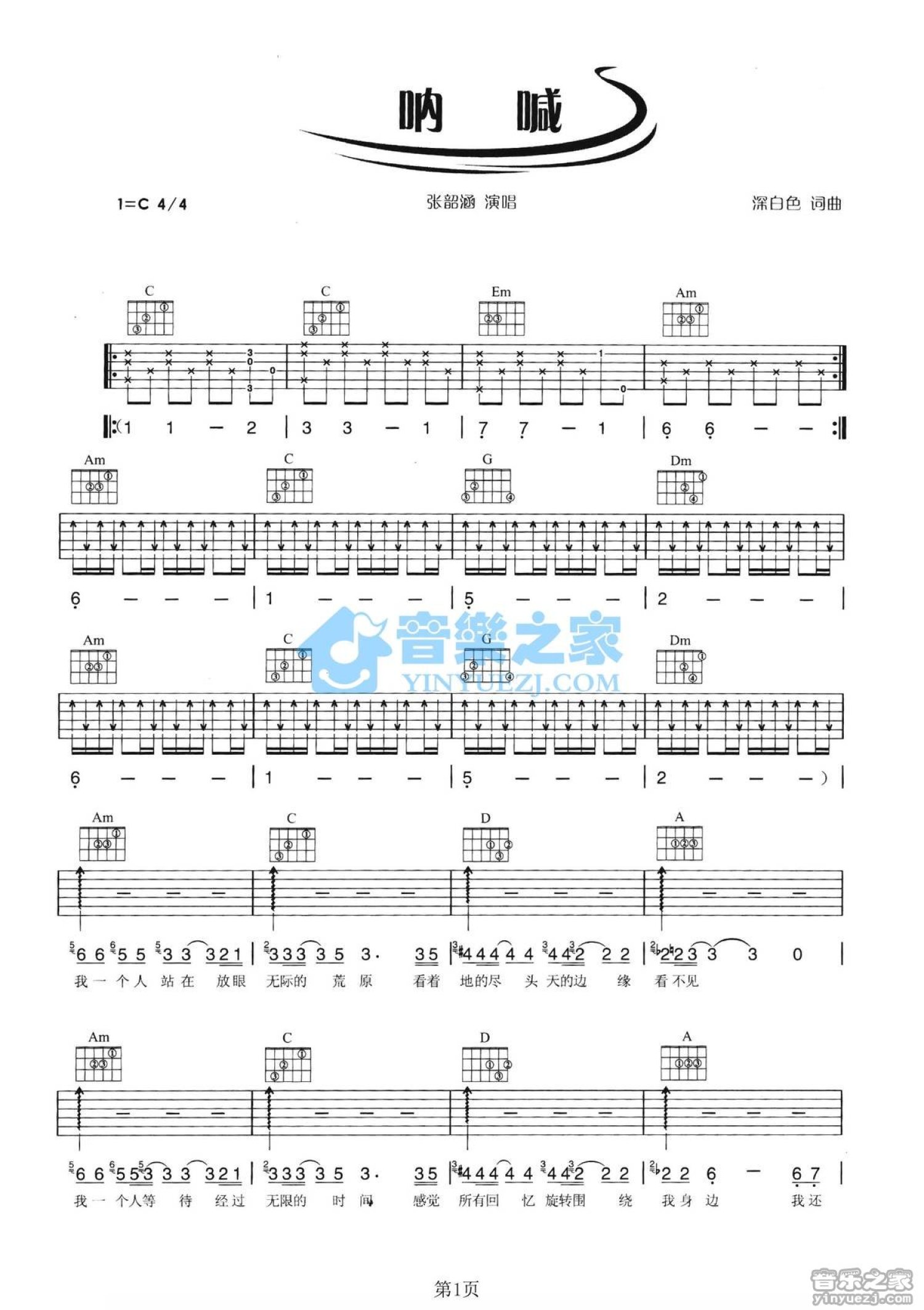 曲谱介绍: C调版《呐喊》吉他弹唱六线谱