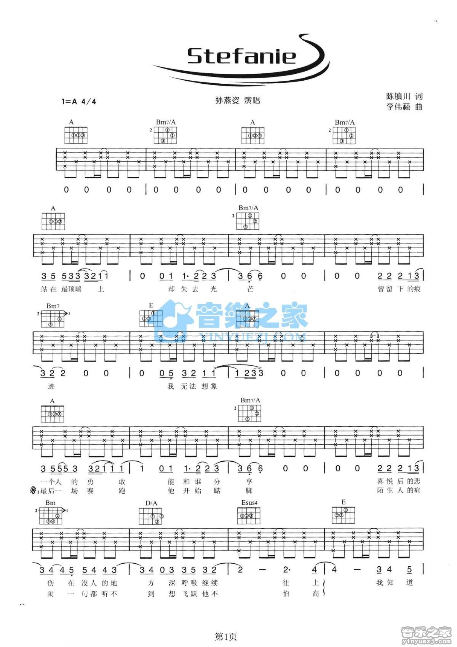 Stefanie吉他谱 - 孙燕姿 - A调吉他弹唱谱