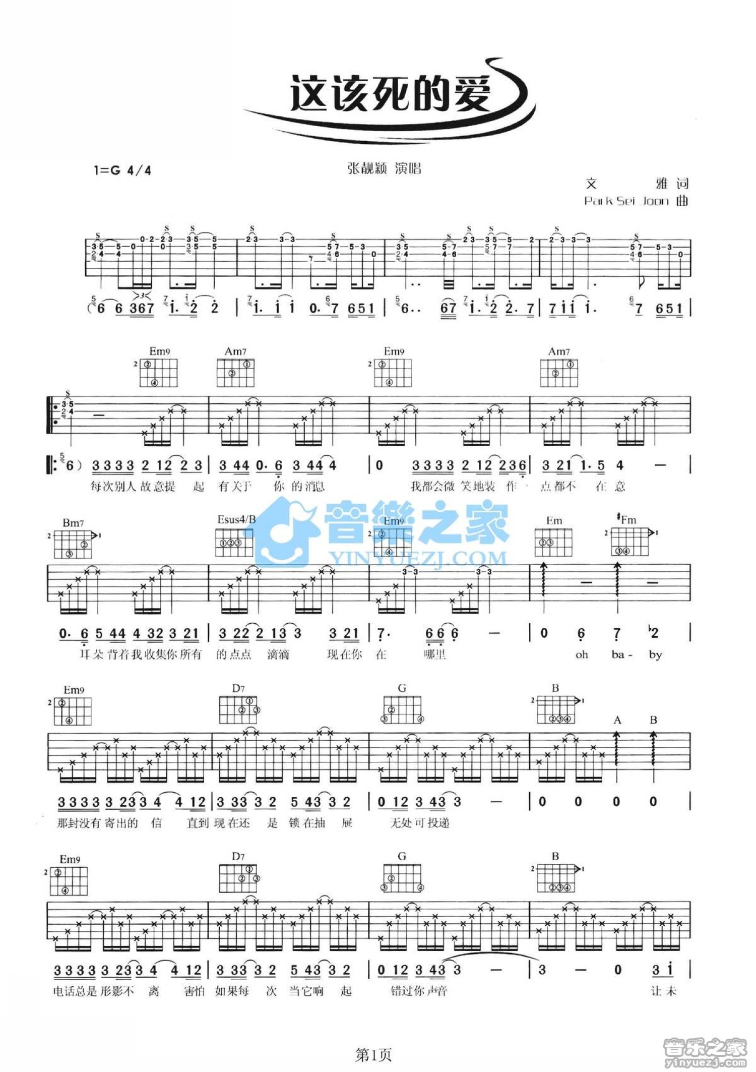 曲谱介绍: G调版张靓颖《该死的爱》吉他弹唱六线谱