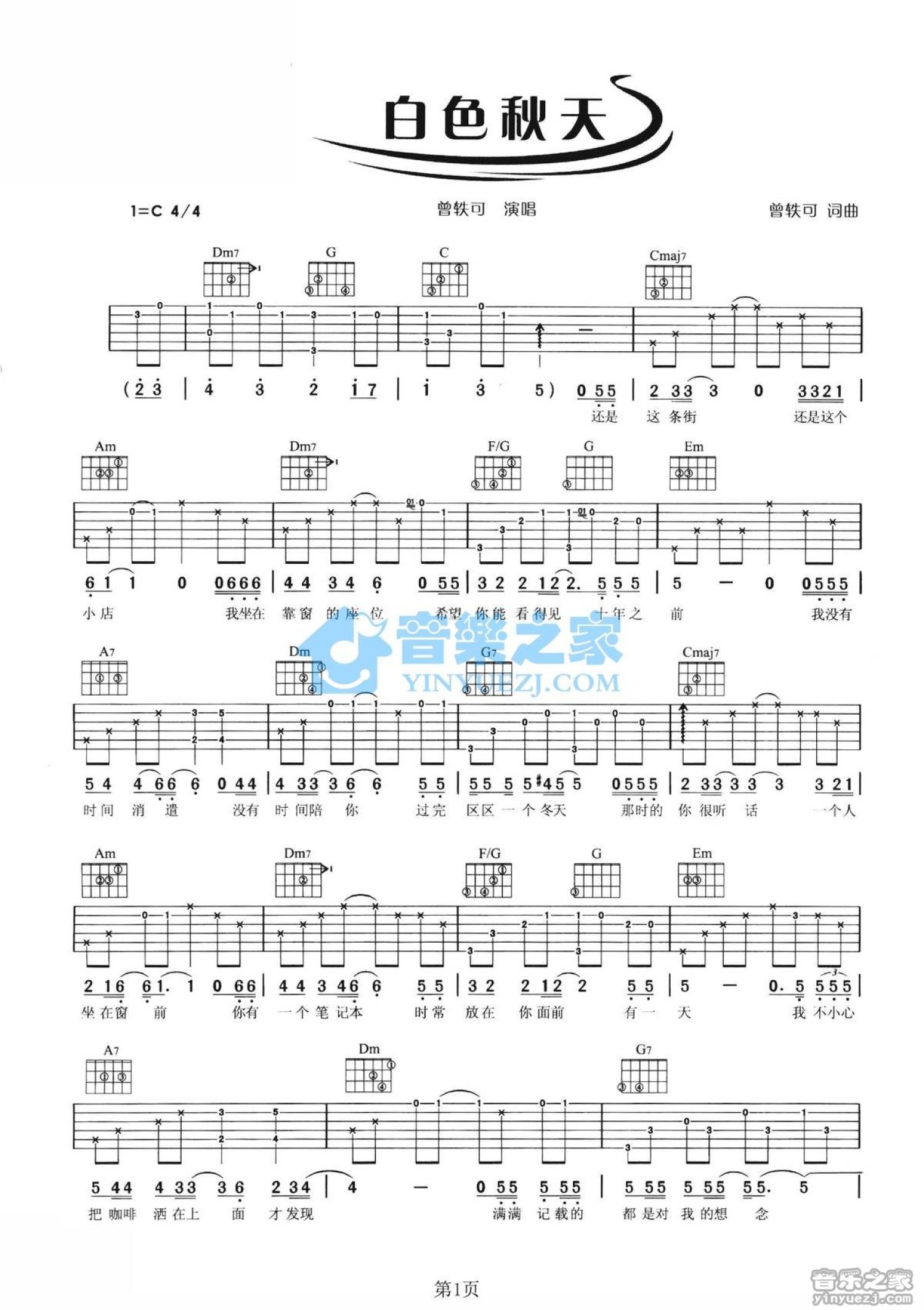 曲谱介绍: C调版曾轶可《白色秋天》吉他弹唱六线谱