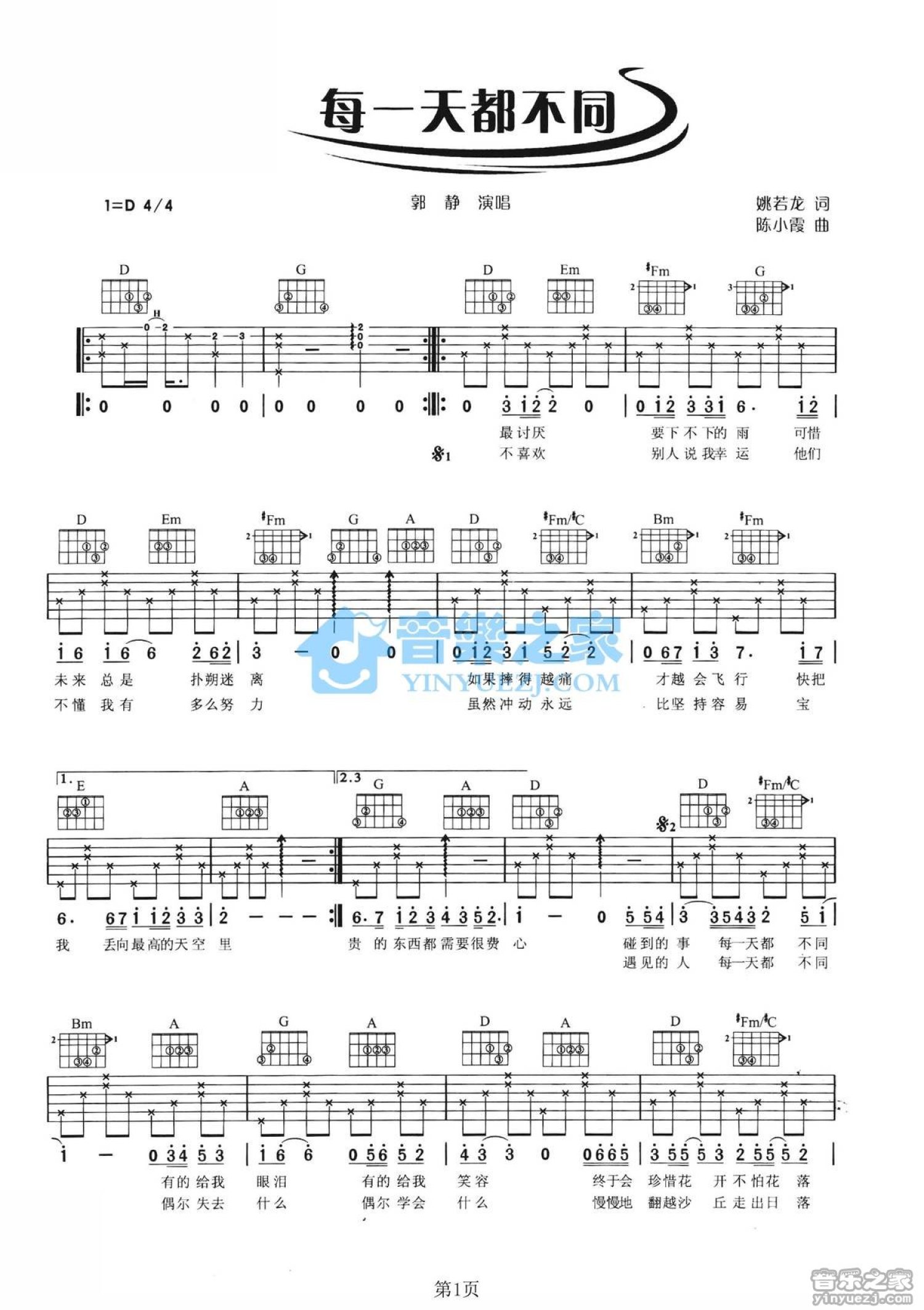 每一天都不同吉他谱 - 郭静 - D调吉他弹唱谱