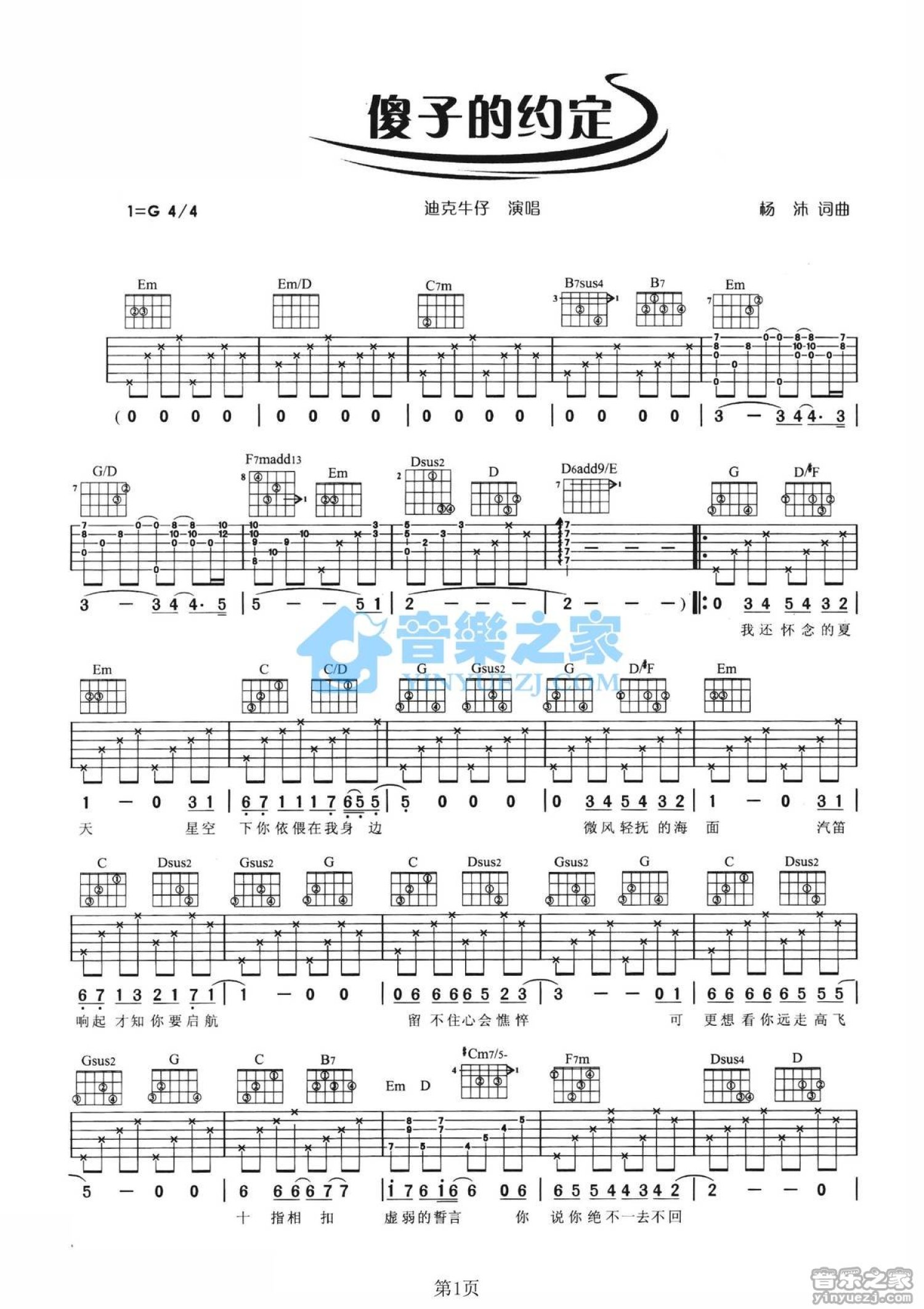 曲谱介绍: G调版迪克牛仔《傻子的约定》吉他弹唱六线谱