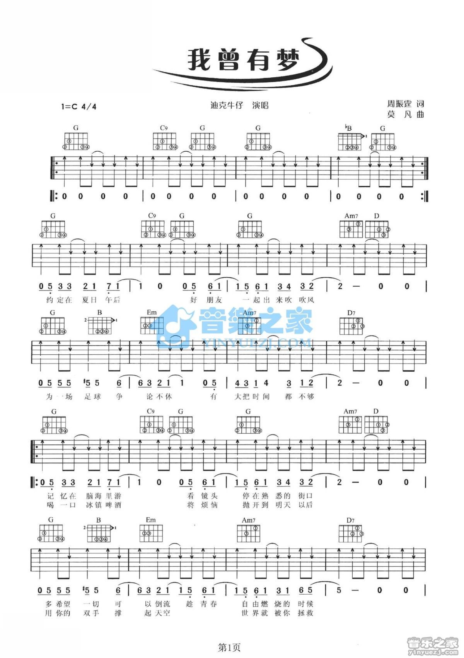 曲谱介绍: C调版迪克牛仔《我曾有梦》吉他弹唱六线谱