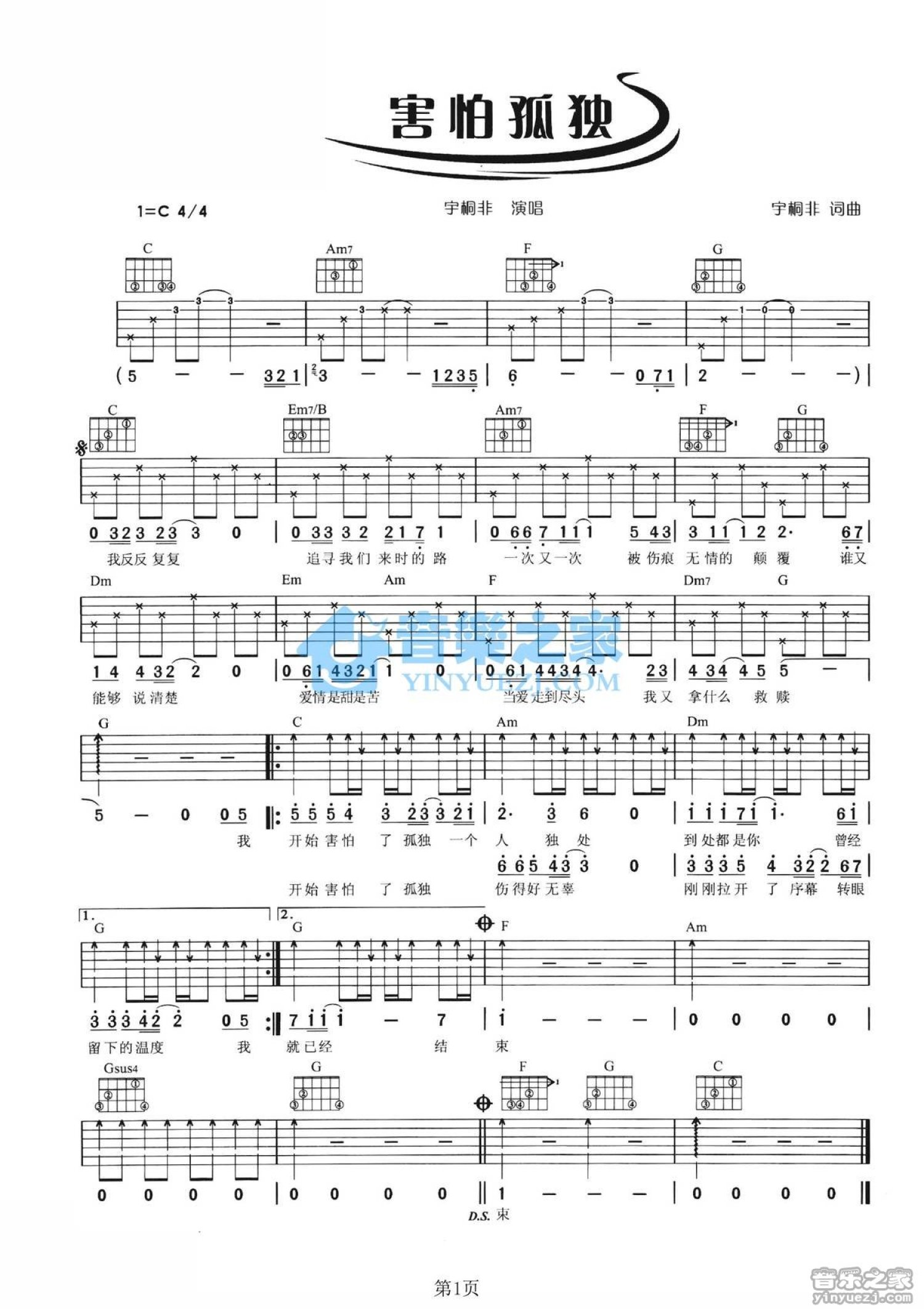 害怕孤独吉他谱 - 宇桐非 - C调吉他弹唱谱