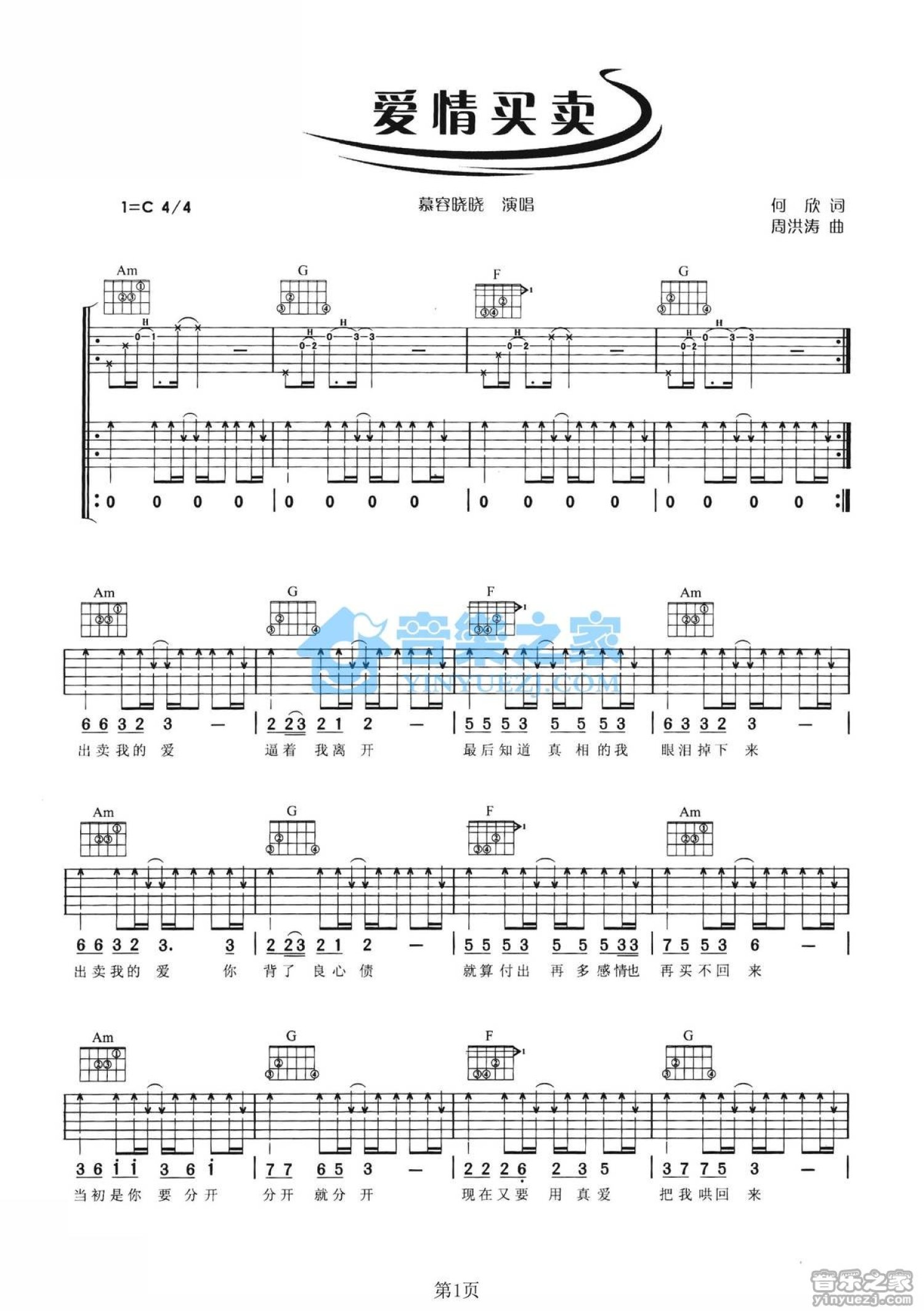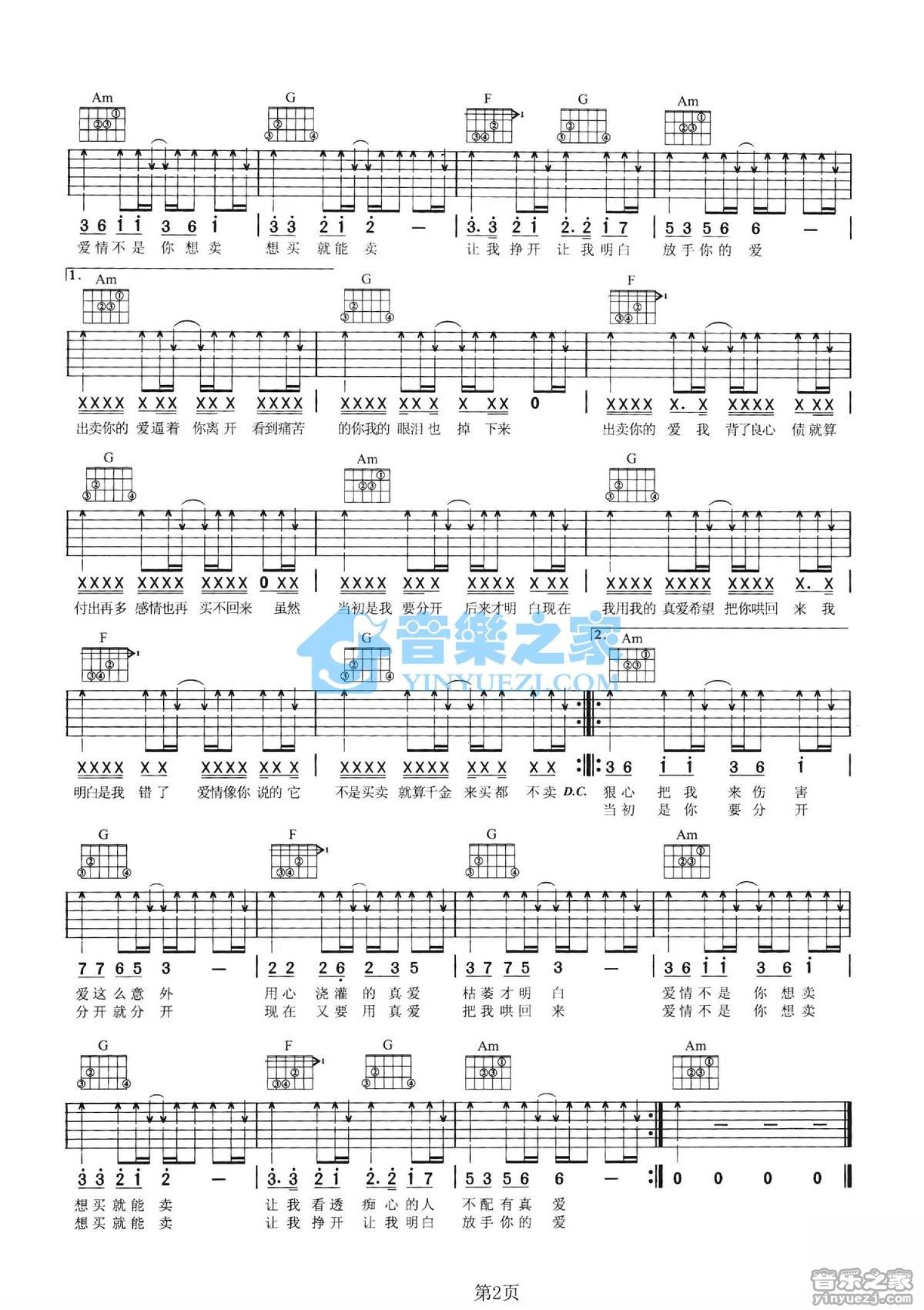 曲谱介绍: C调《爱情买卖》吉他弹唱六线谱