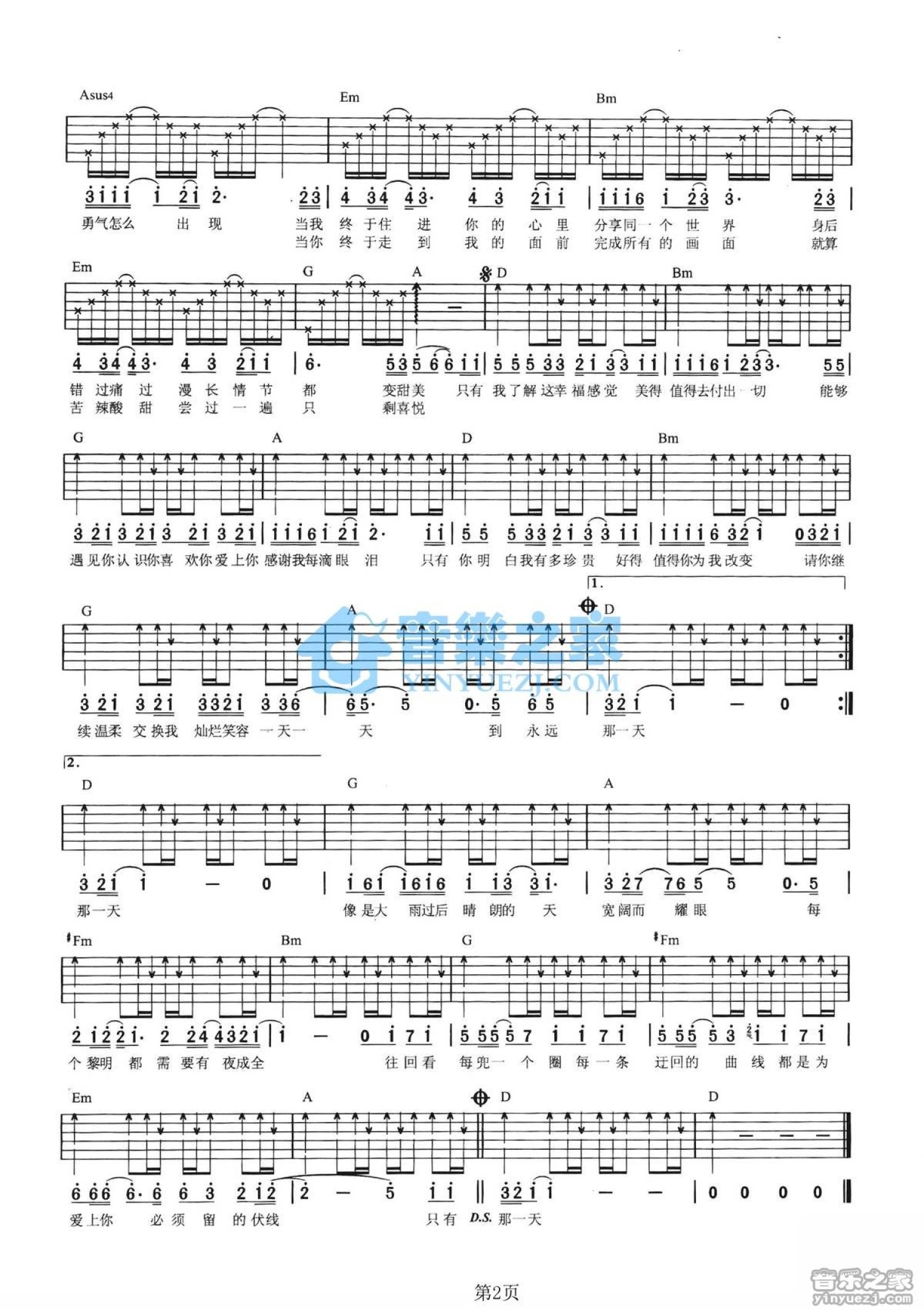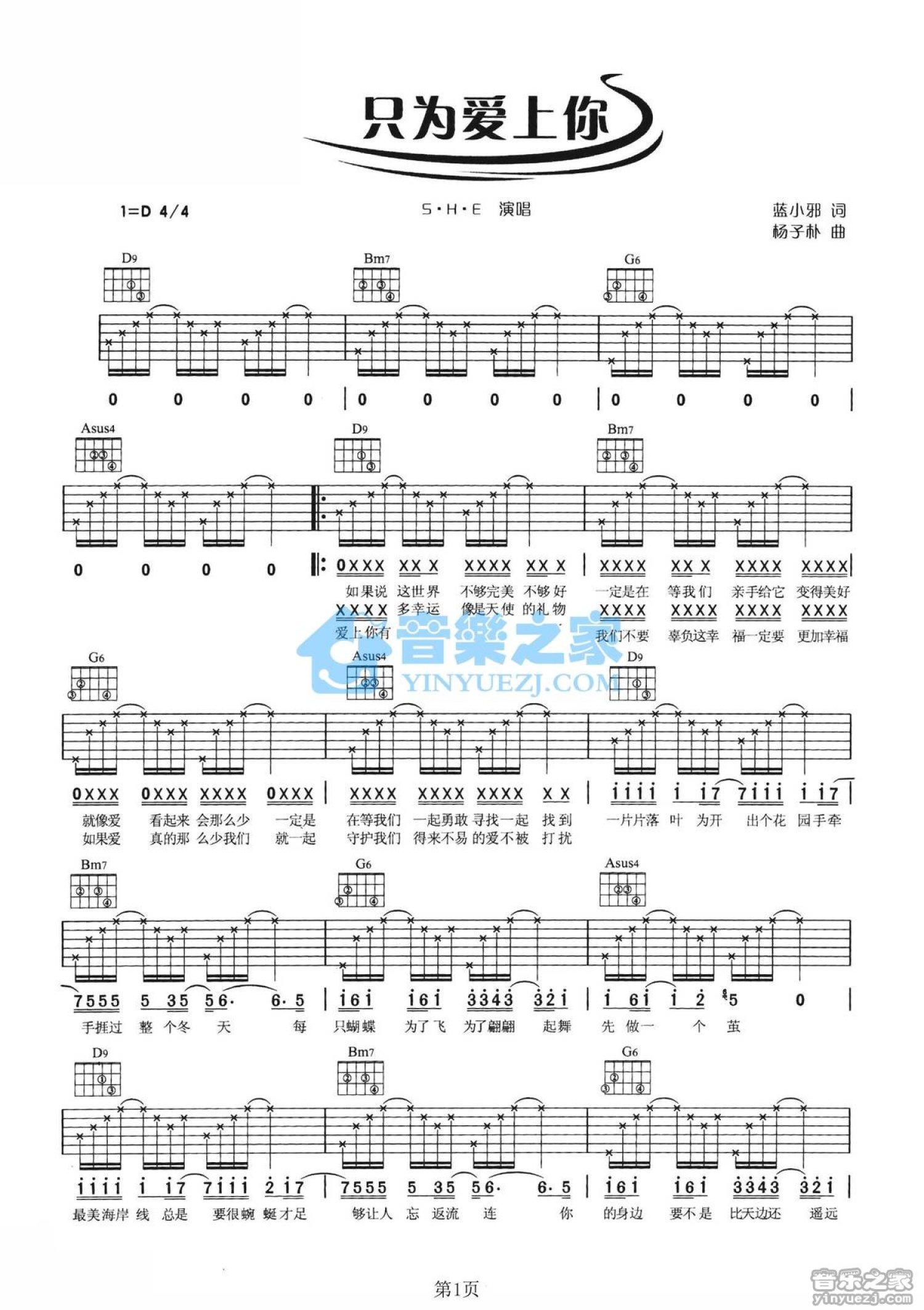 曲谱介绍: D调版S.H.E《只为爱上你》吉他弹唱六线谱