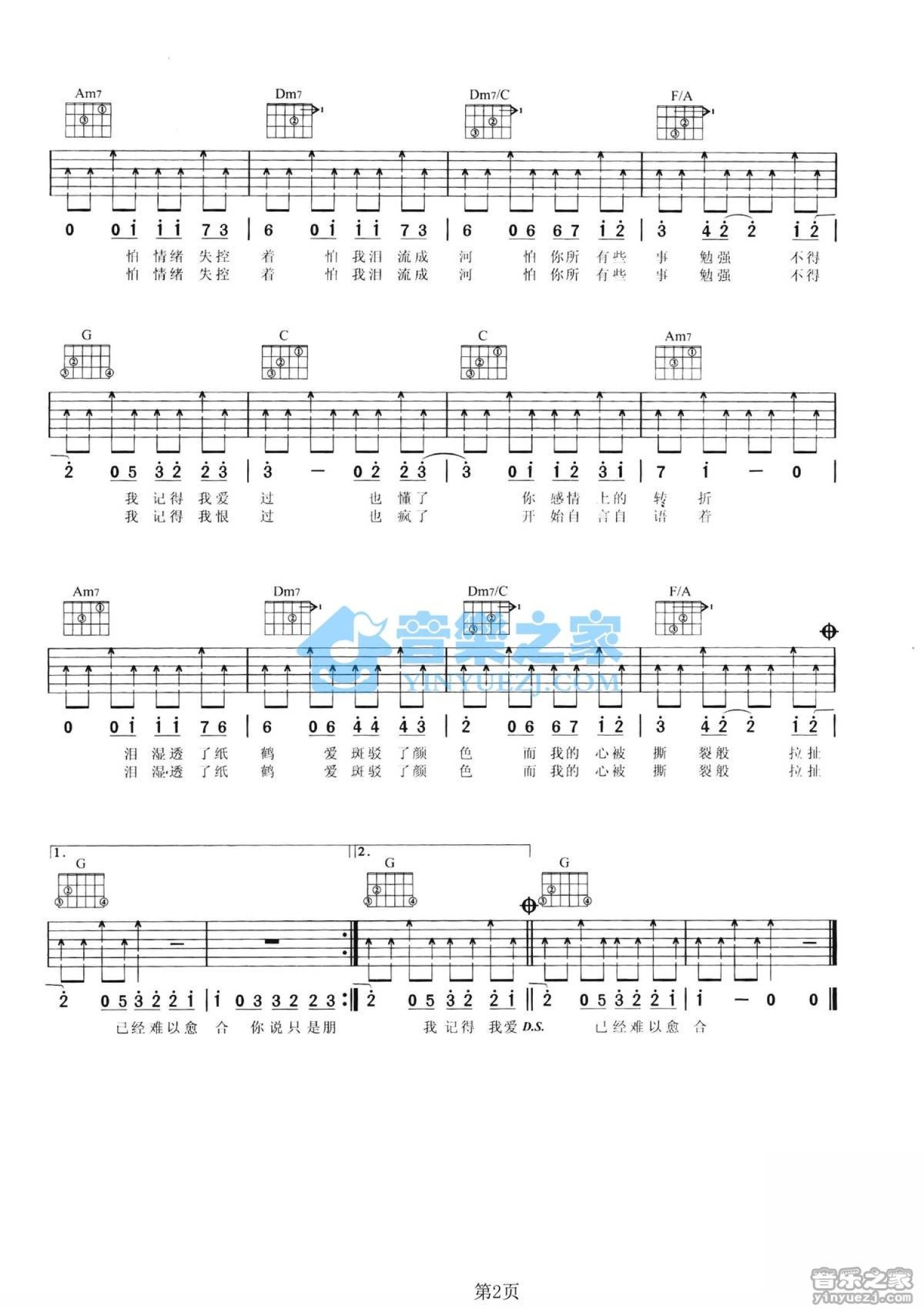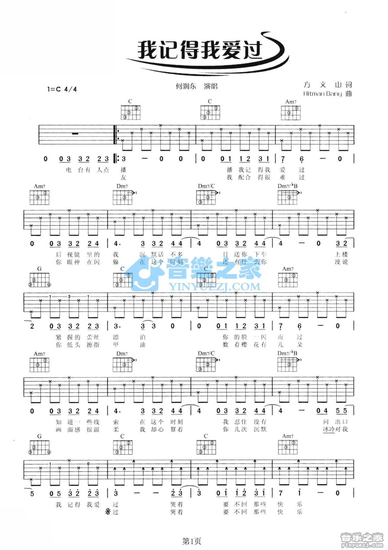 曲谱介绍: C调版《我记得我爱过》吉他弹唱六线谱
