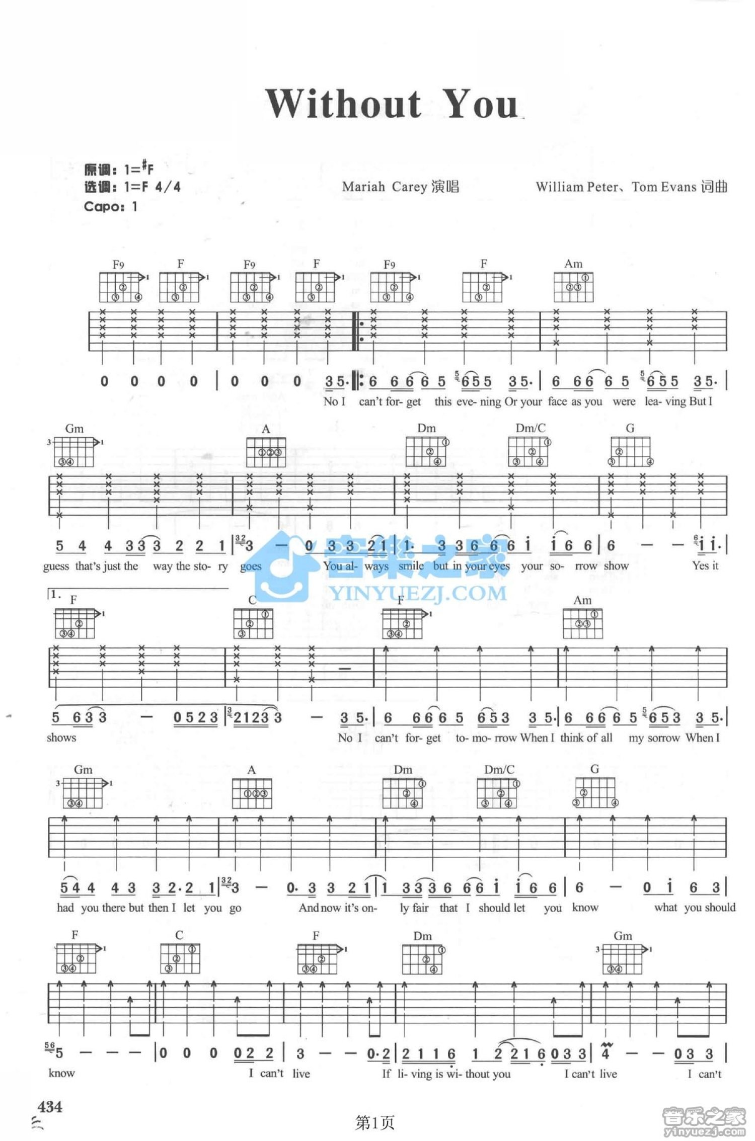 曲谱介绍: F调版MariahCarey《WithoutYou》吉他弹唱六线谱