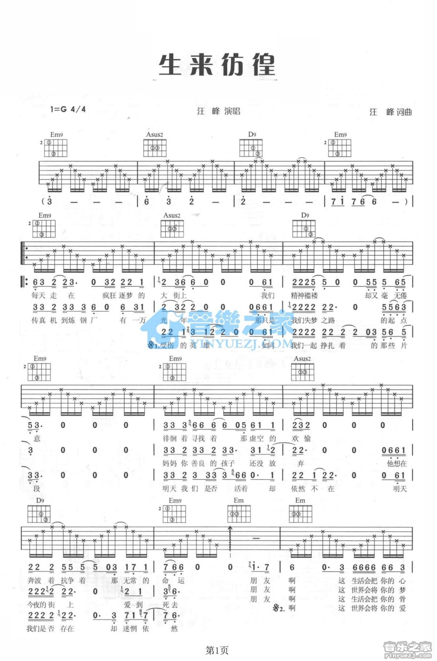 生来彷徨吉他谱 - 汪峰 - G调吉他弹唱谱