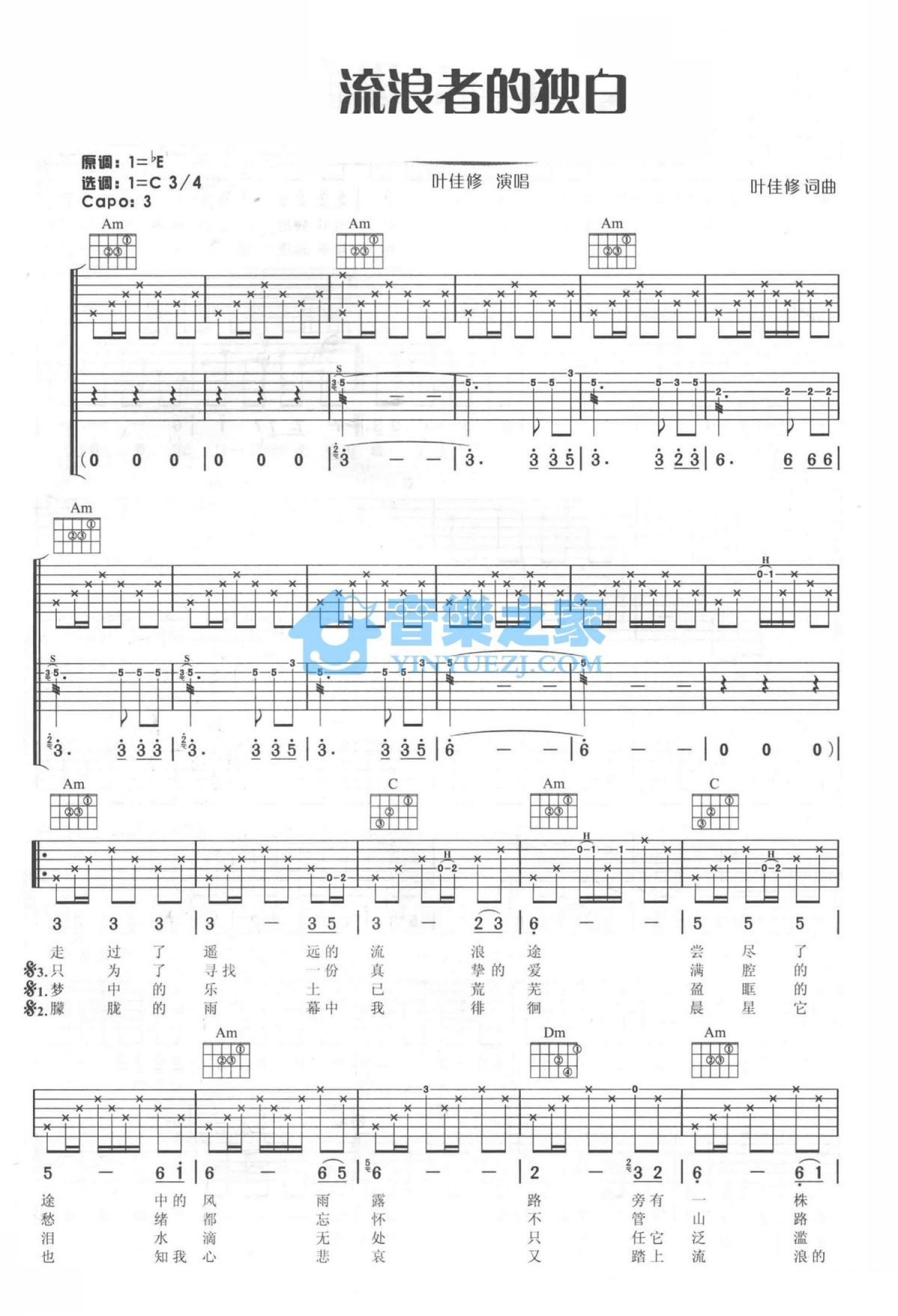 曲谱介绍: C调《流浪者的独白》吉他弹唱六线谱