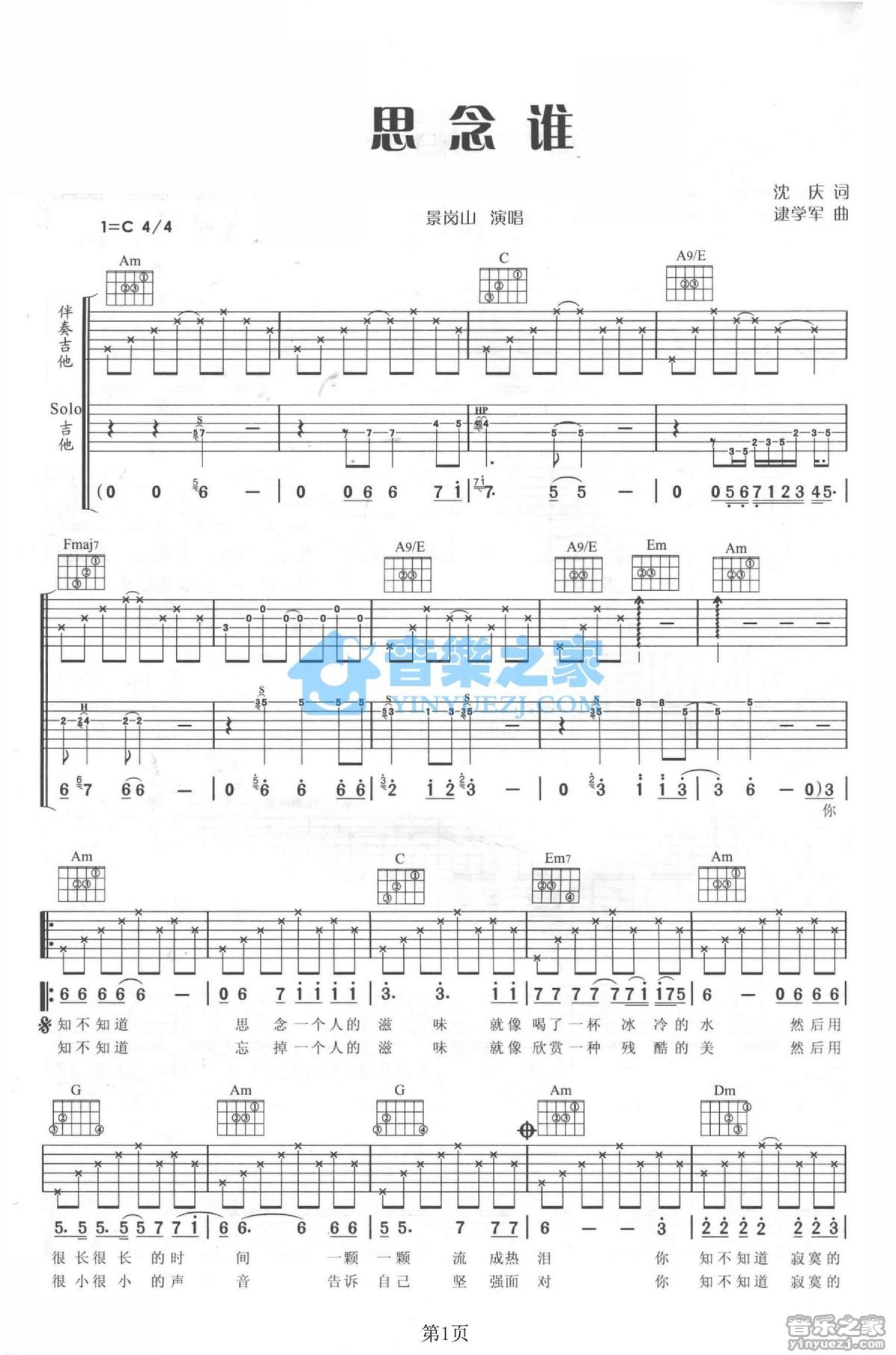 曲谱介绍: C调双吉他版景岗山《思念谁》吉他弹唱六线谱