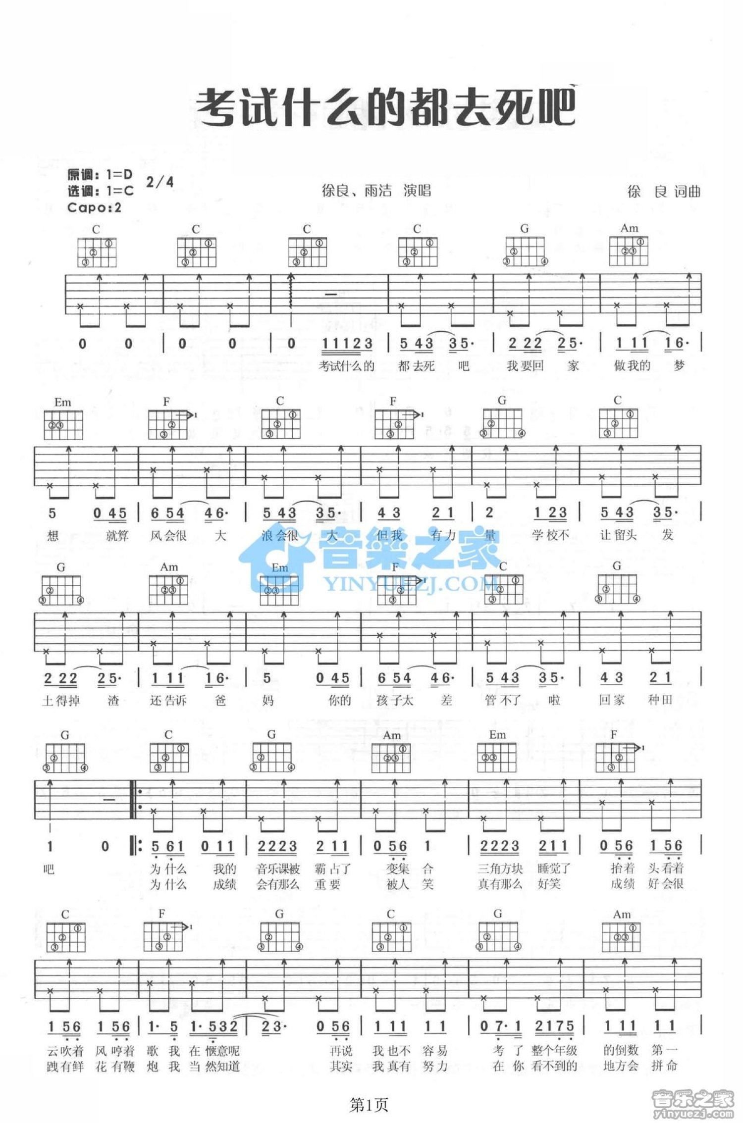 考试什么的都去死吧吉他谱 - 徐良/雨洁 - C调吉他弹唱谱