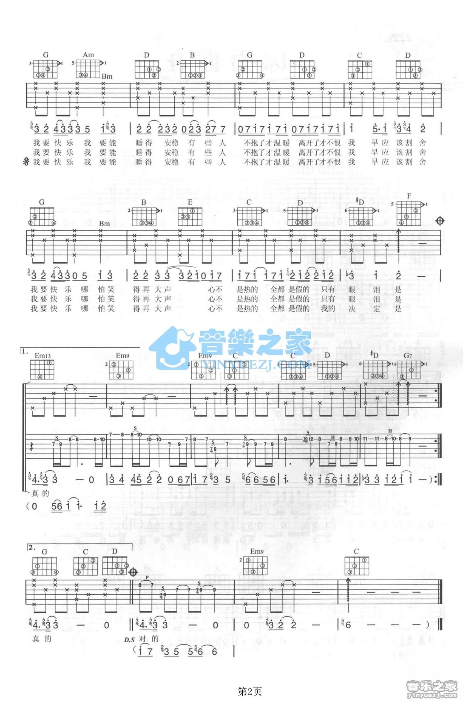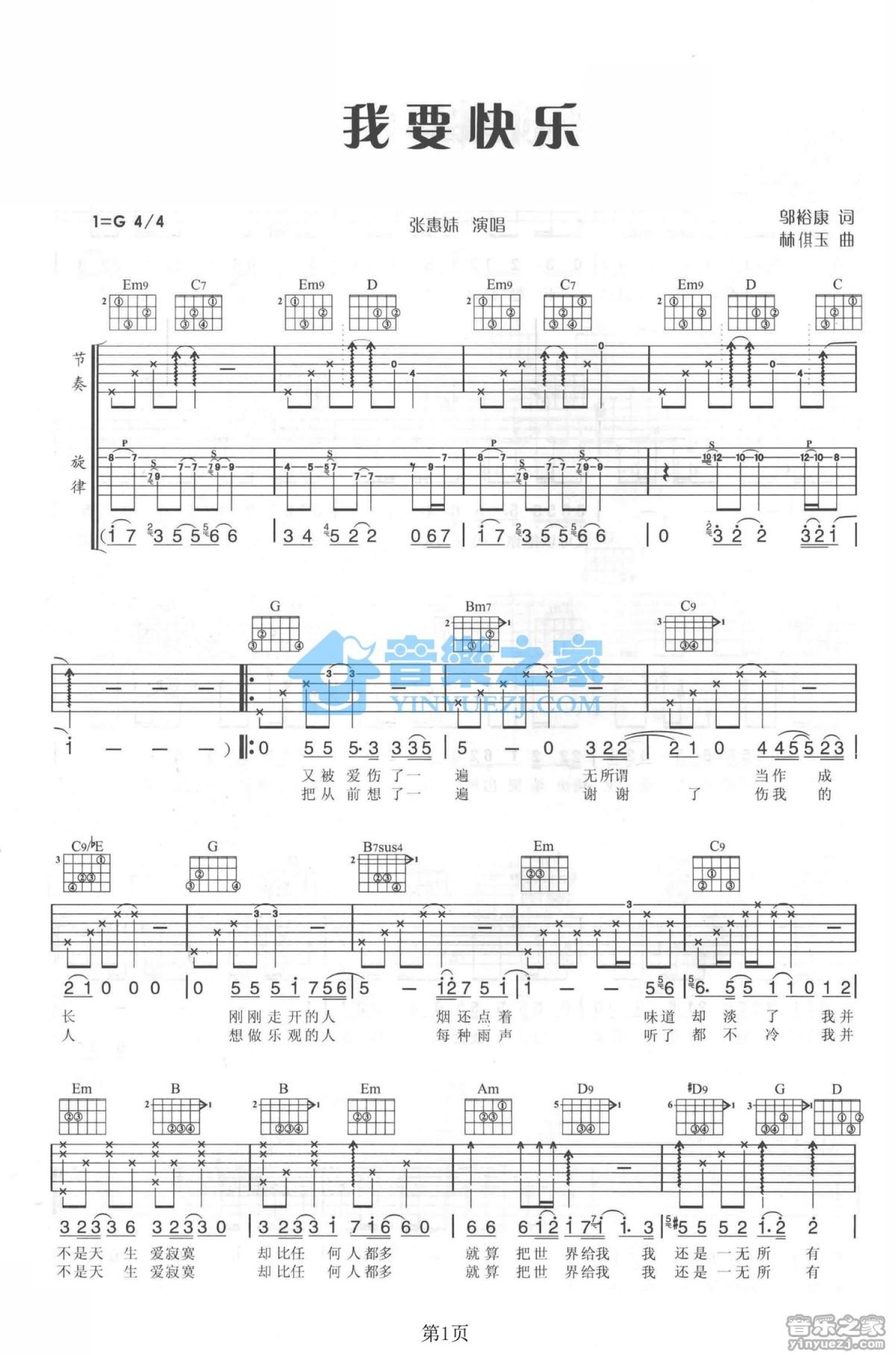 曲谱介绍: G调《我要快乐》吉他弹唱六线谱