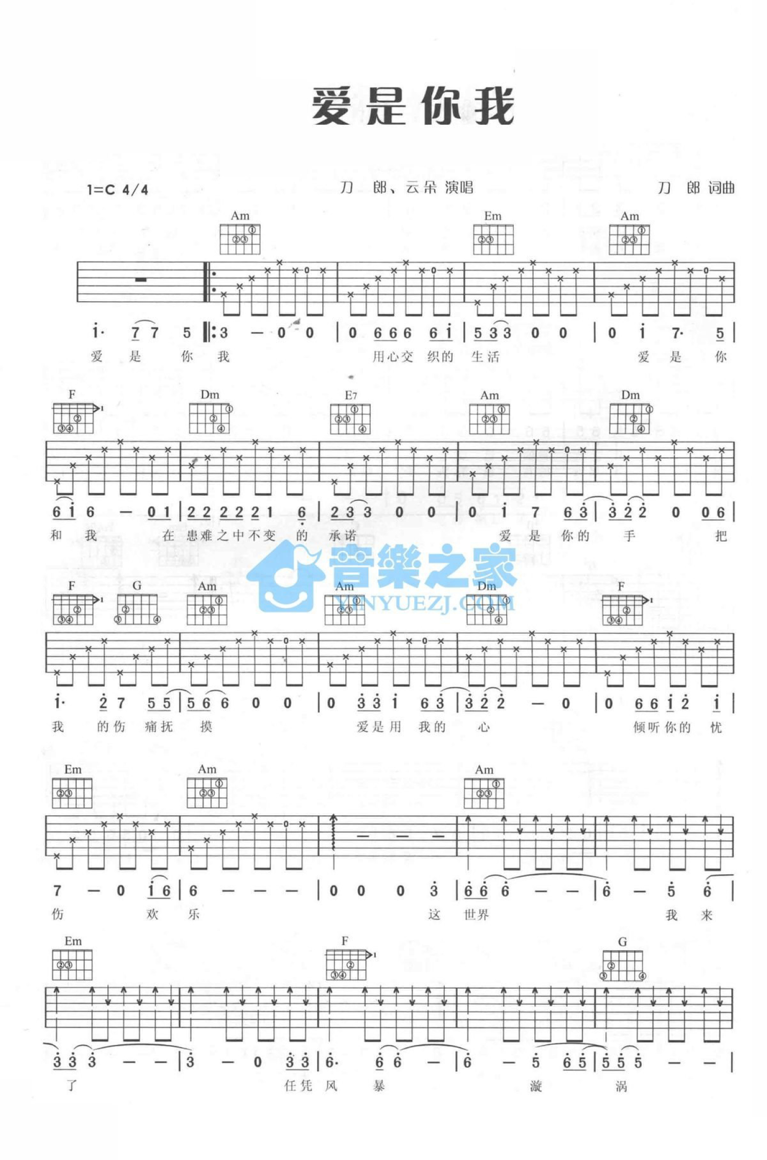 爱是你我吉他谱 - 刀郎/云朵 - C调吉他弹唱谱