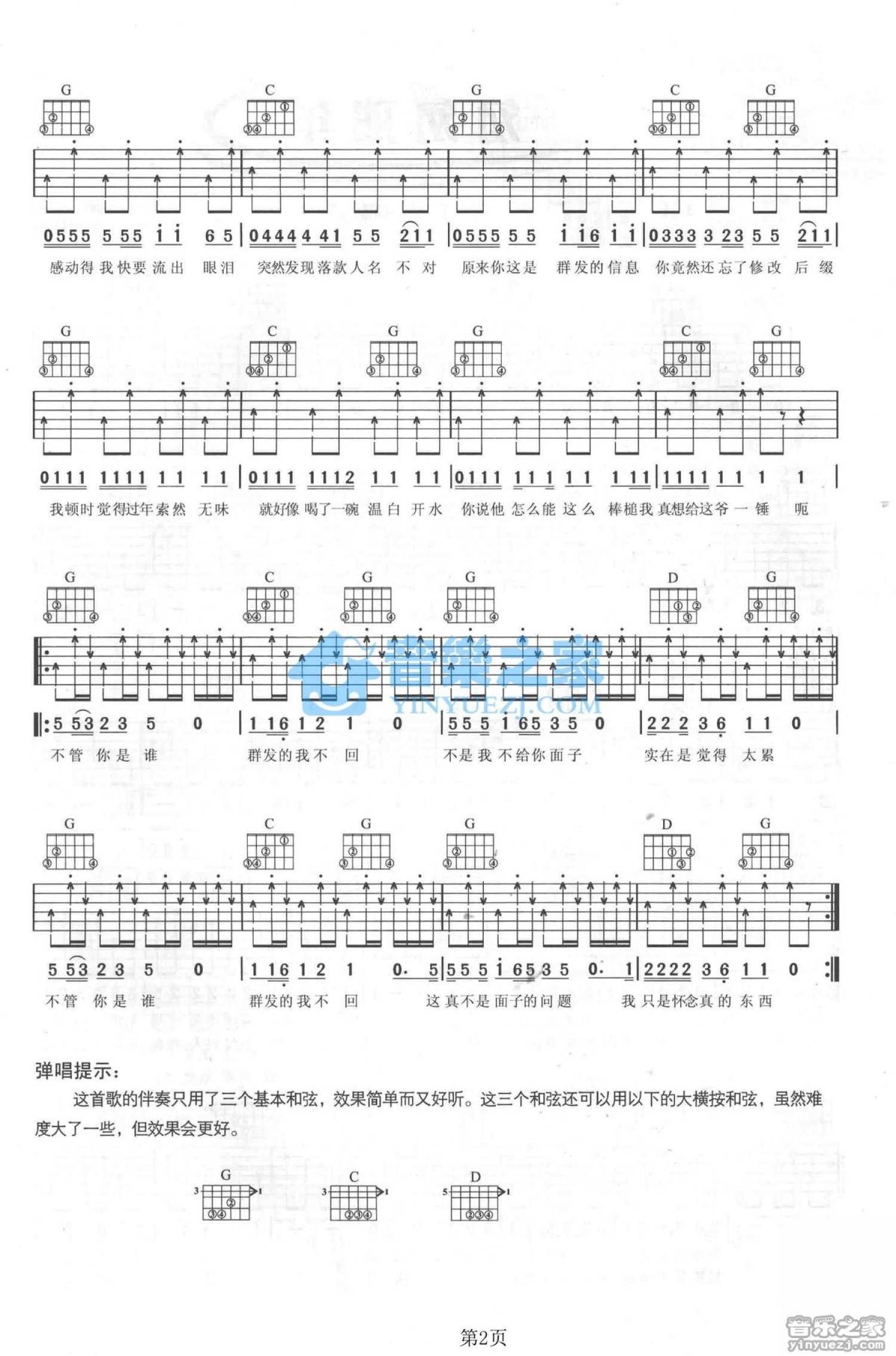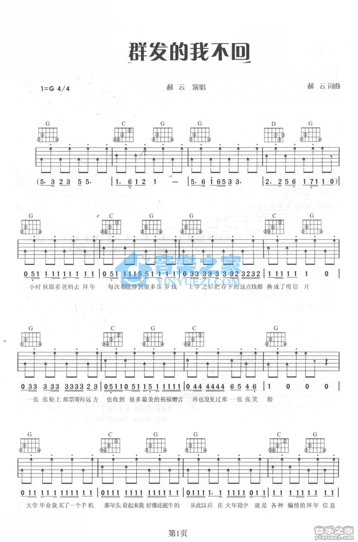 曲谱介绍: G调版郝云《群发的我不回》吉他弹唱六线谱