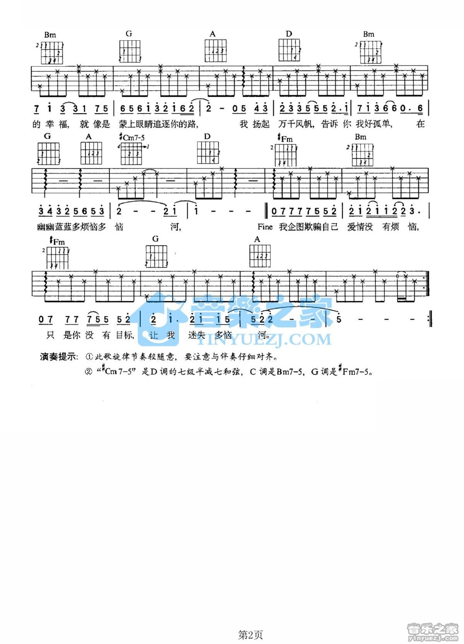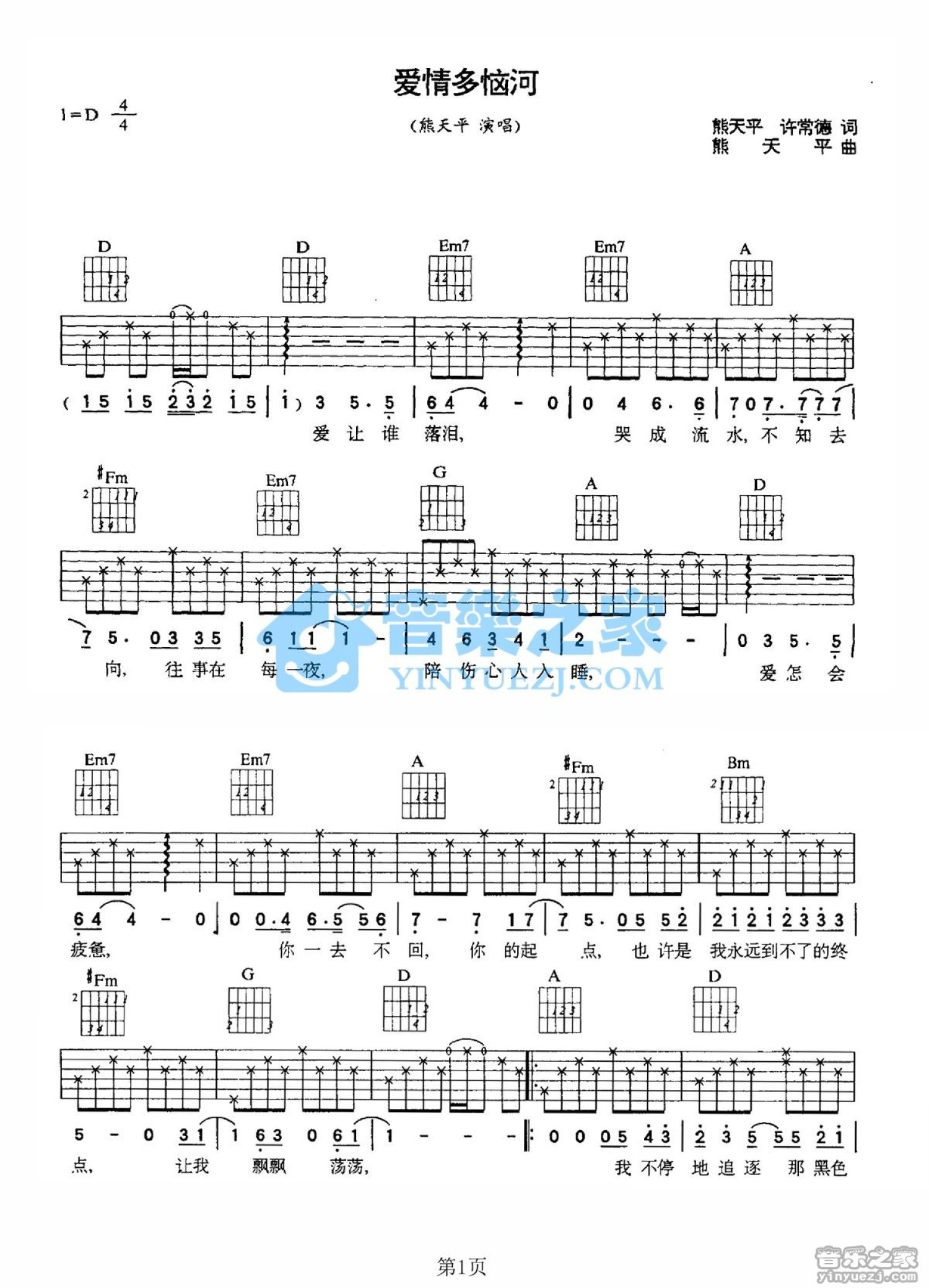曲谱介绍: D调版熊天平《爱情多恼河》吉他弹唱六线谱
