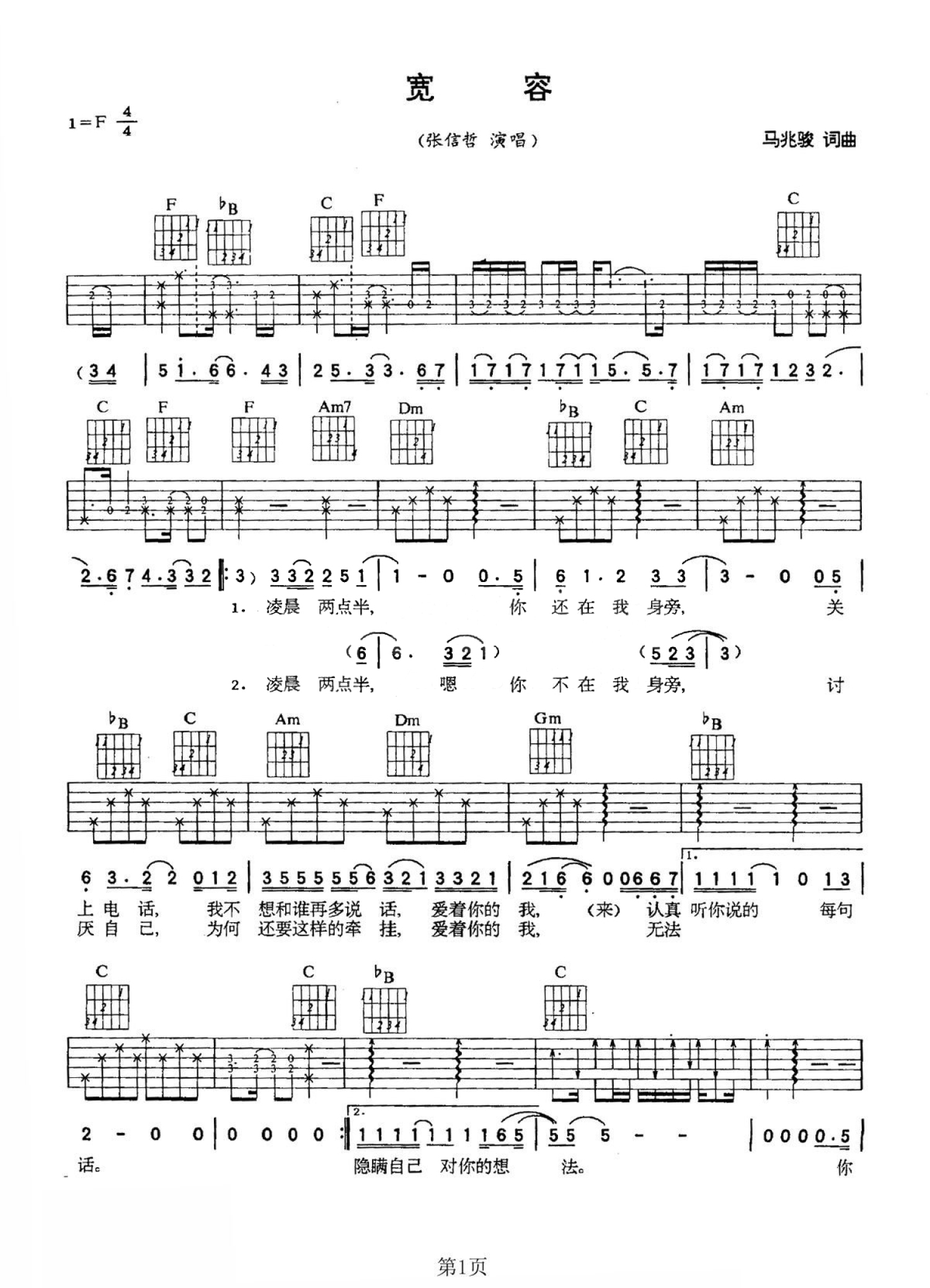 曲谱介绍: F调版张信哲《宽容》吉他弹唱六线谱