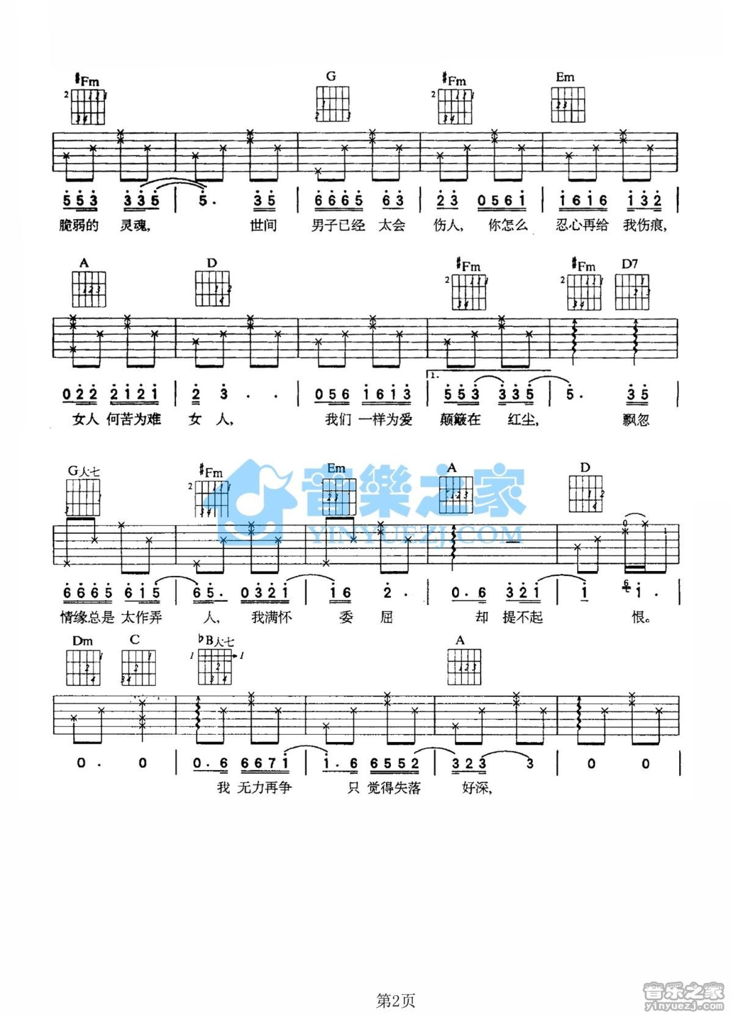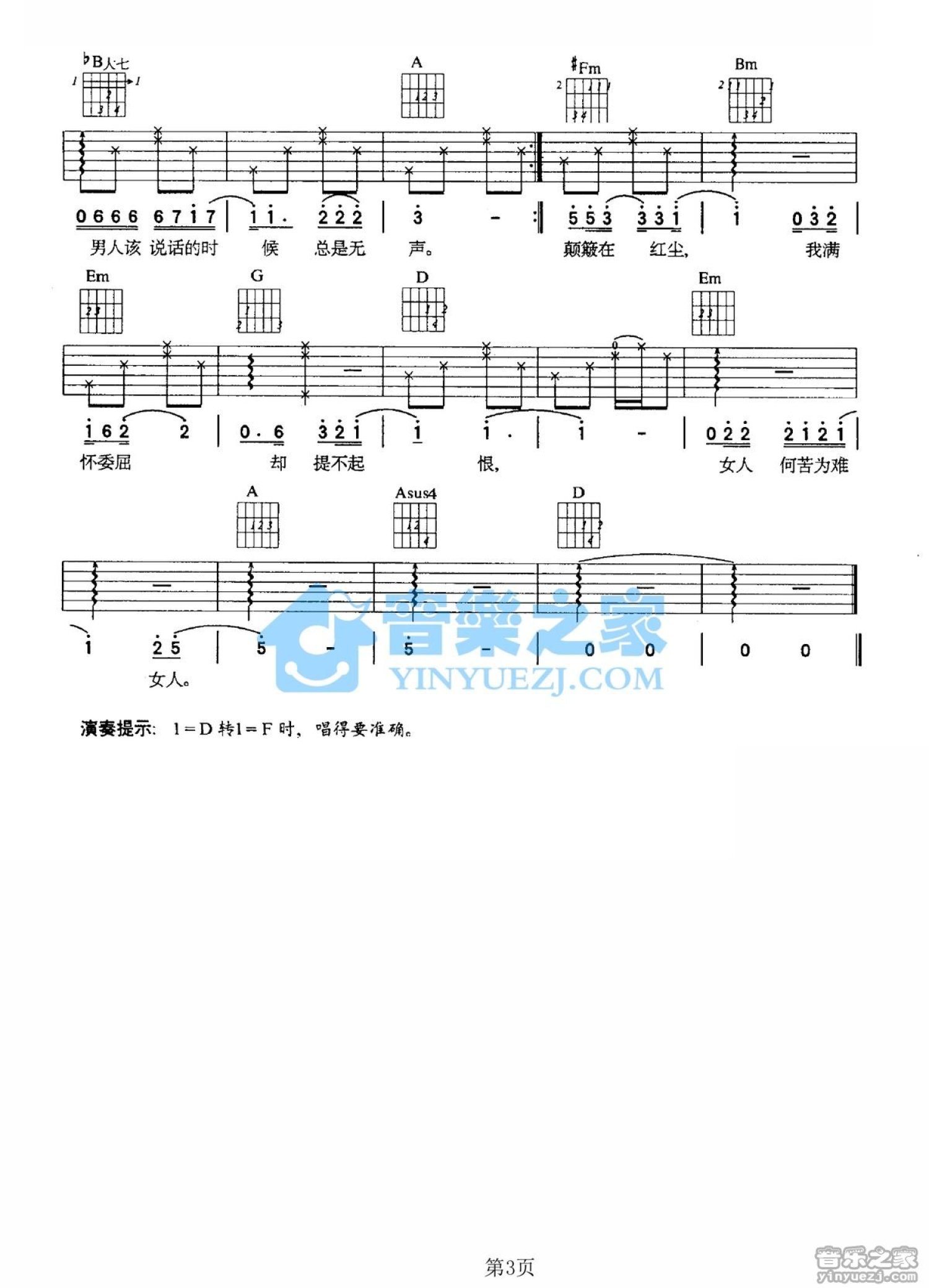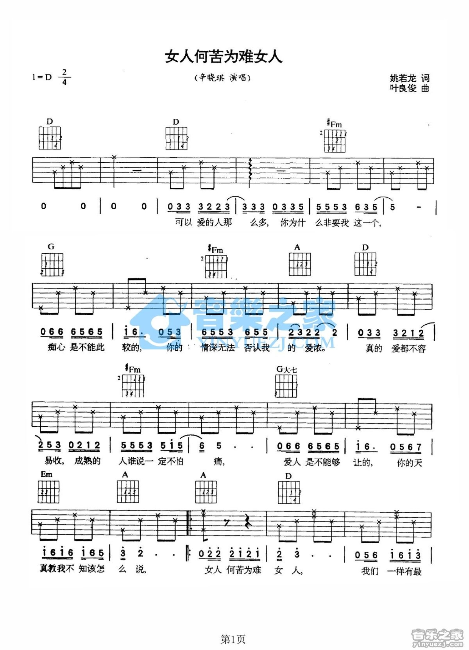 曲谱介绍: D调版《女人何苦为难女人》吉他弹唱六线谱