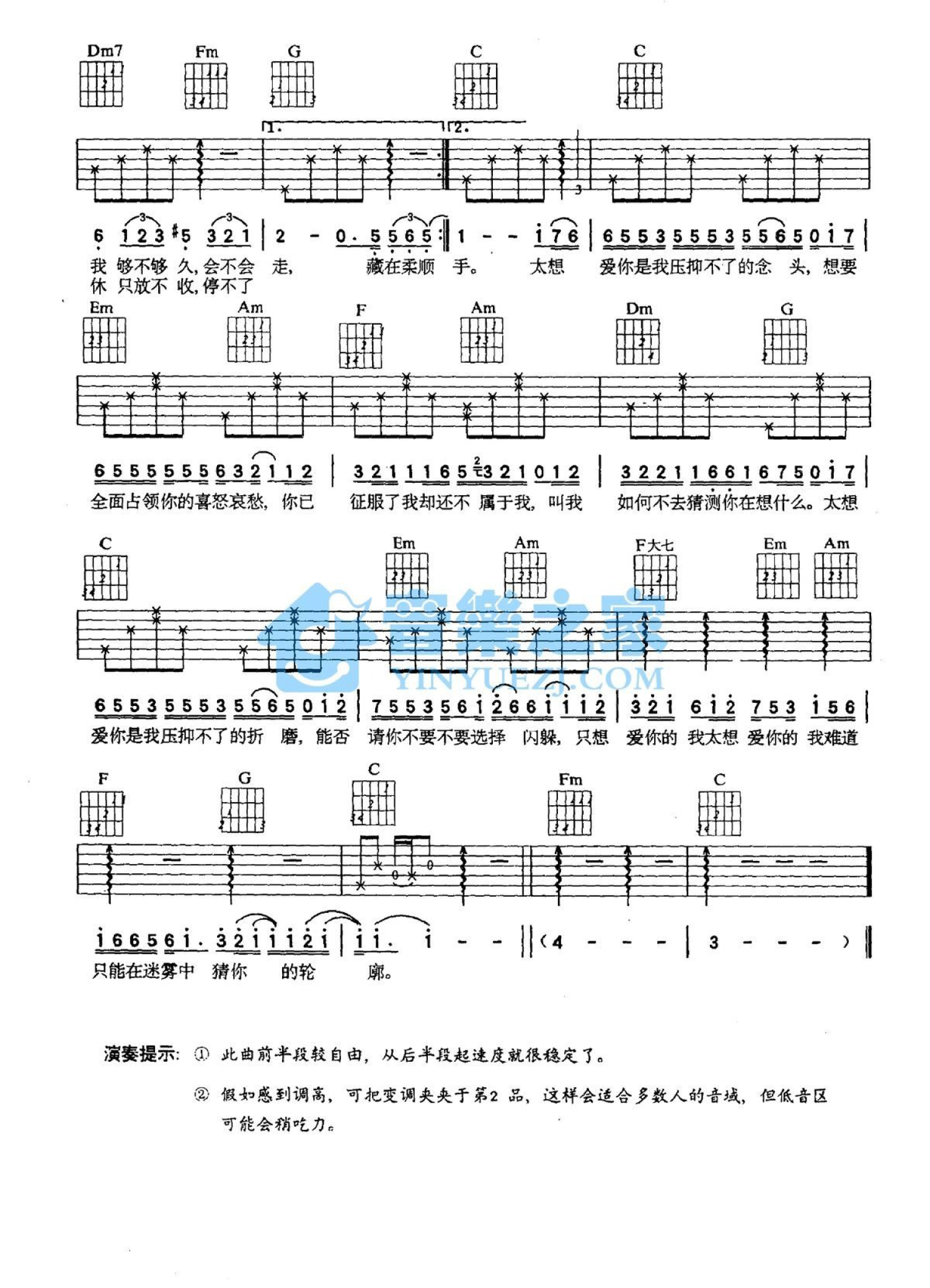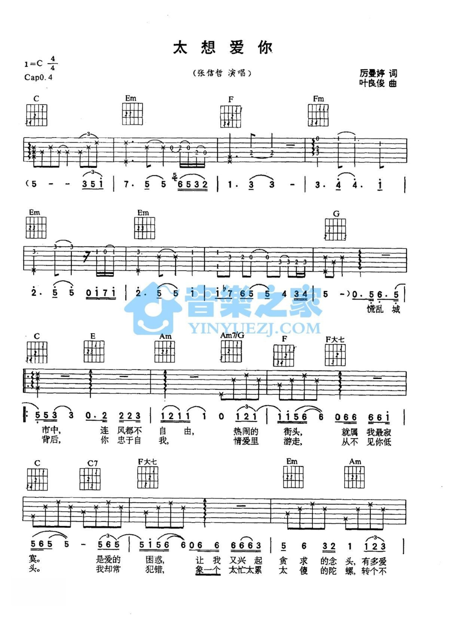曲谱介绍: C调版张信哲《太想爱你》吉他弹唱六线谱
