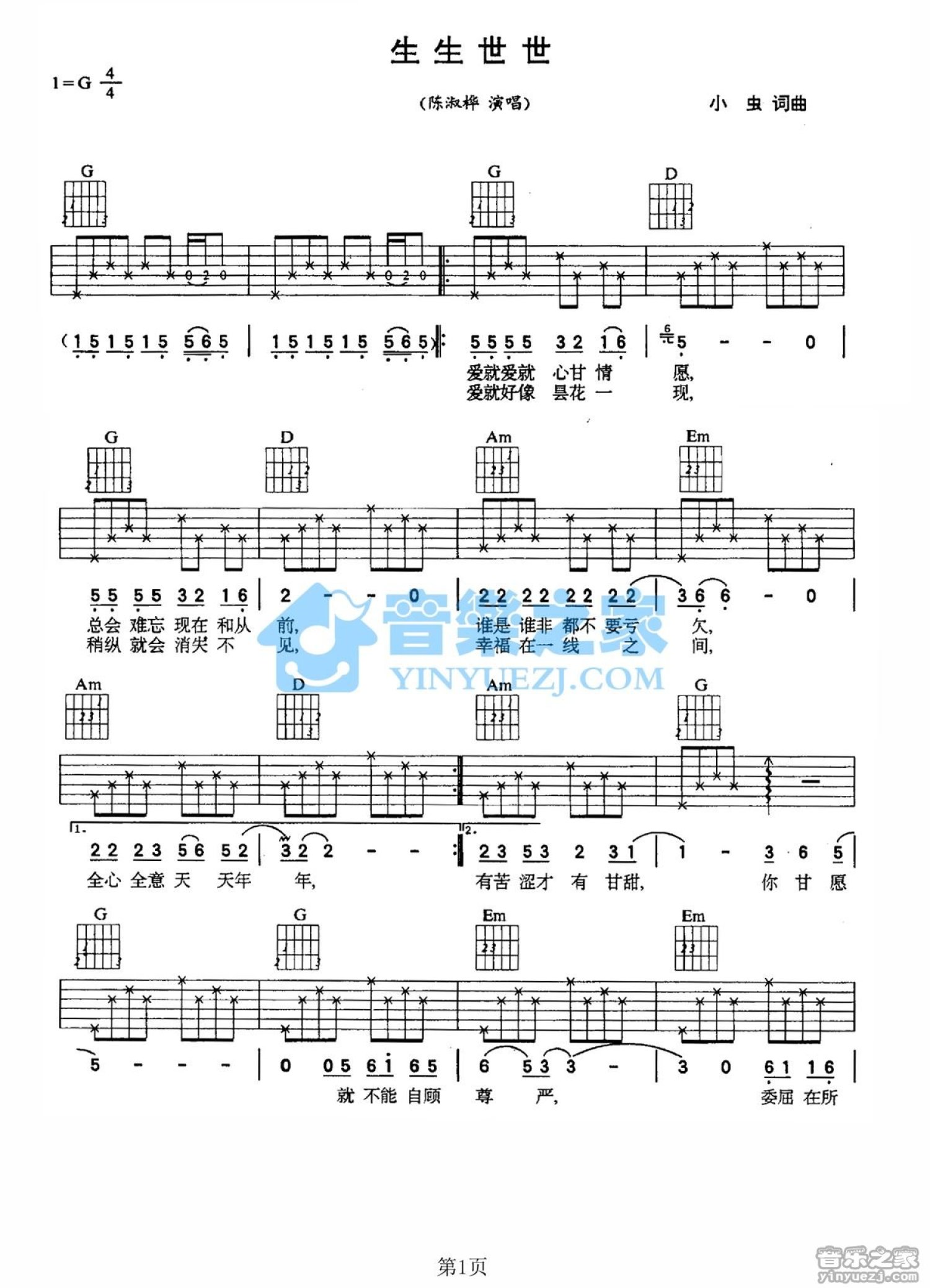 曲谱介绍: G调版陈淑桦《生生世世》吉他弹唱六线谱