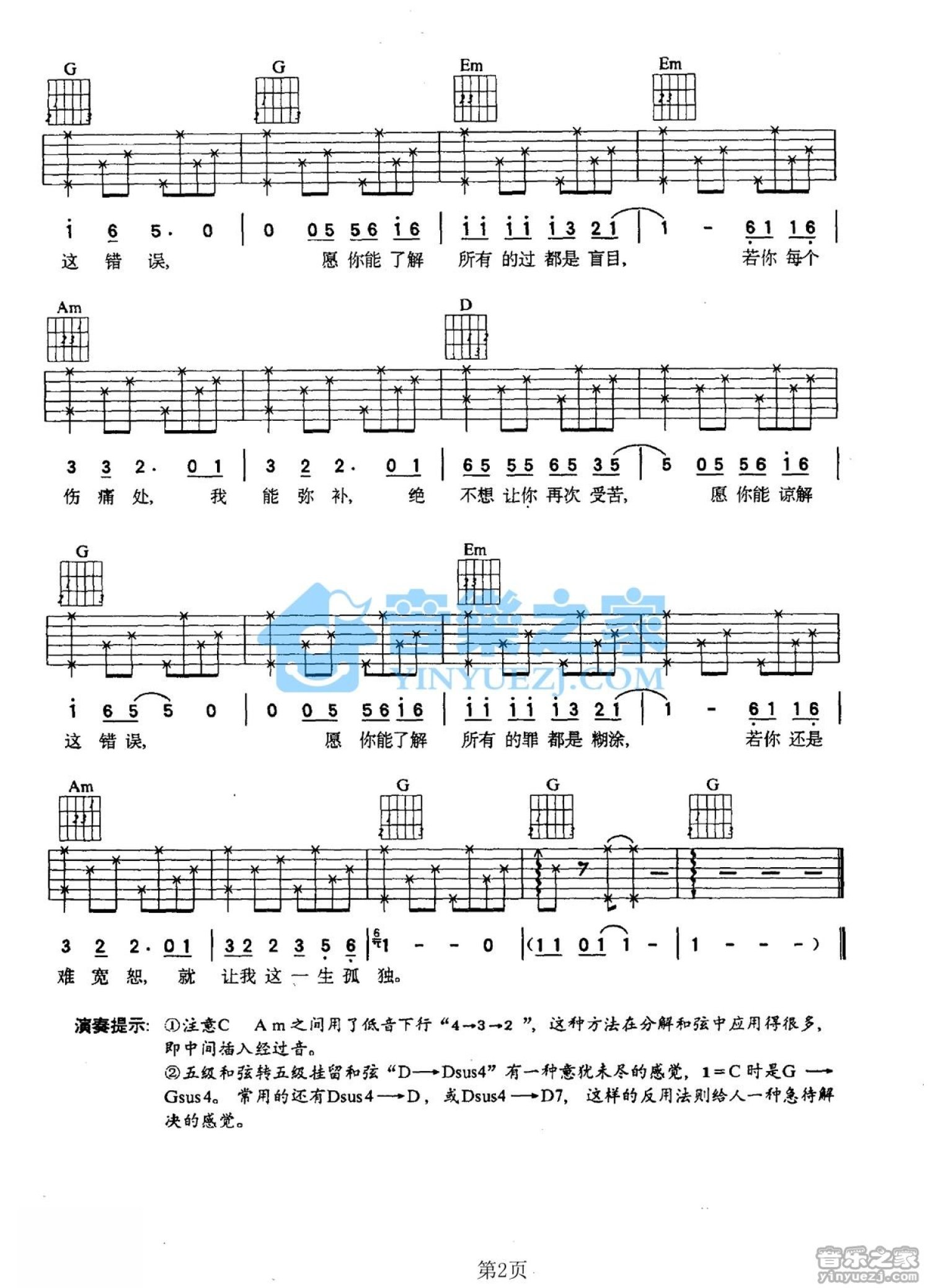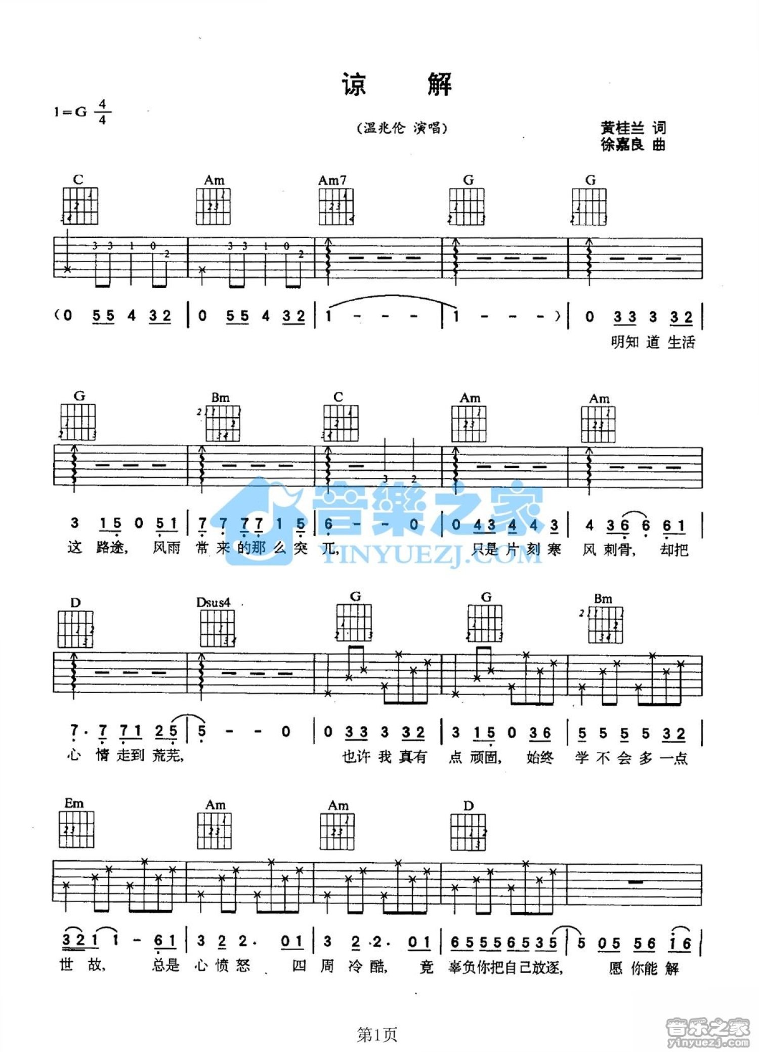 曲谱介绍: G调版温兆伦《谅解》吉他弹唱六线谱