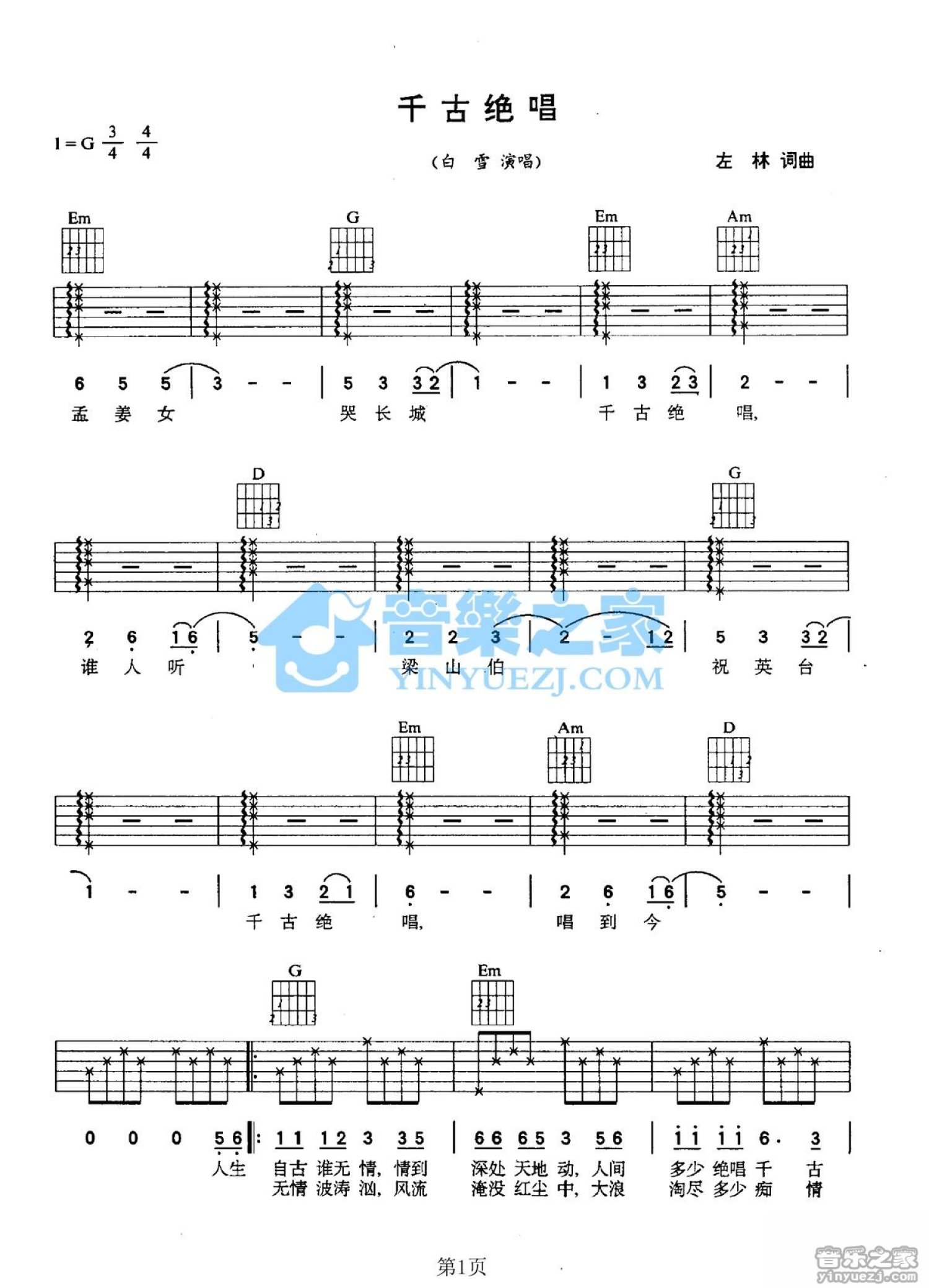 曲谱介绍: G调版 白雪《千古绝唱》吉他弹唱六线谱