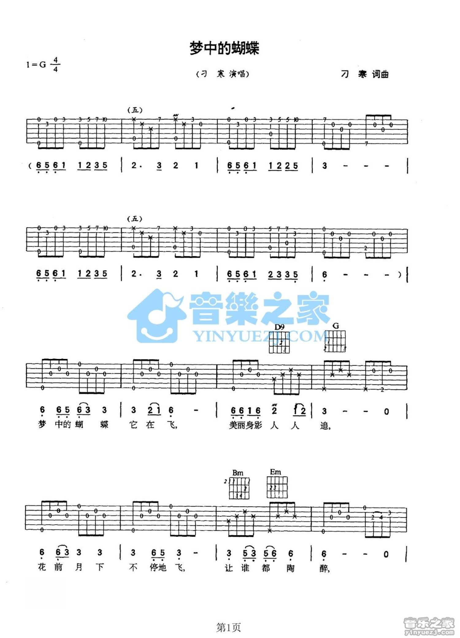 曲谱介绍: G调版刁寒《梦中的蝴蝶》吉他弹唱六线谱