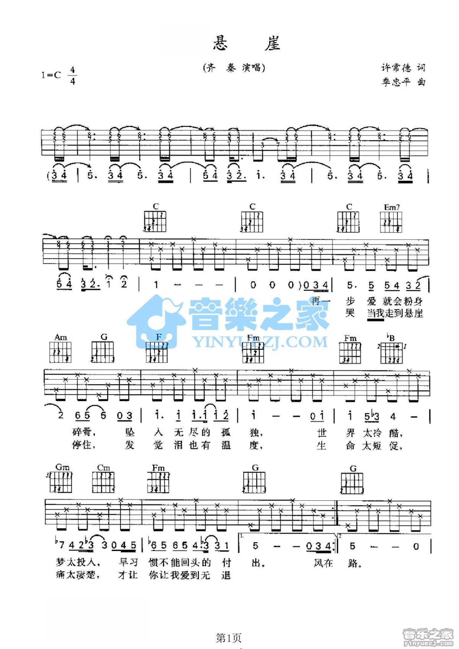 曲谱介绍: C调版齐秦《悬崖》吉他弹唱六线谱