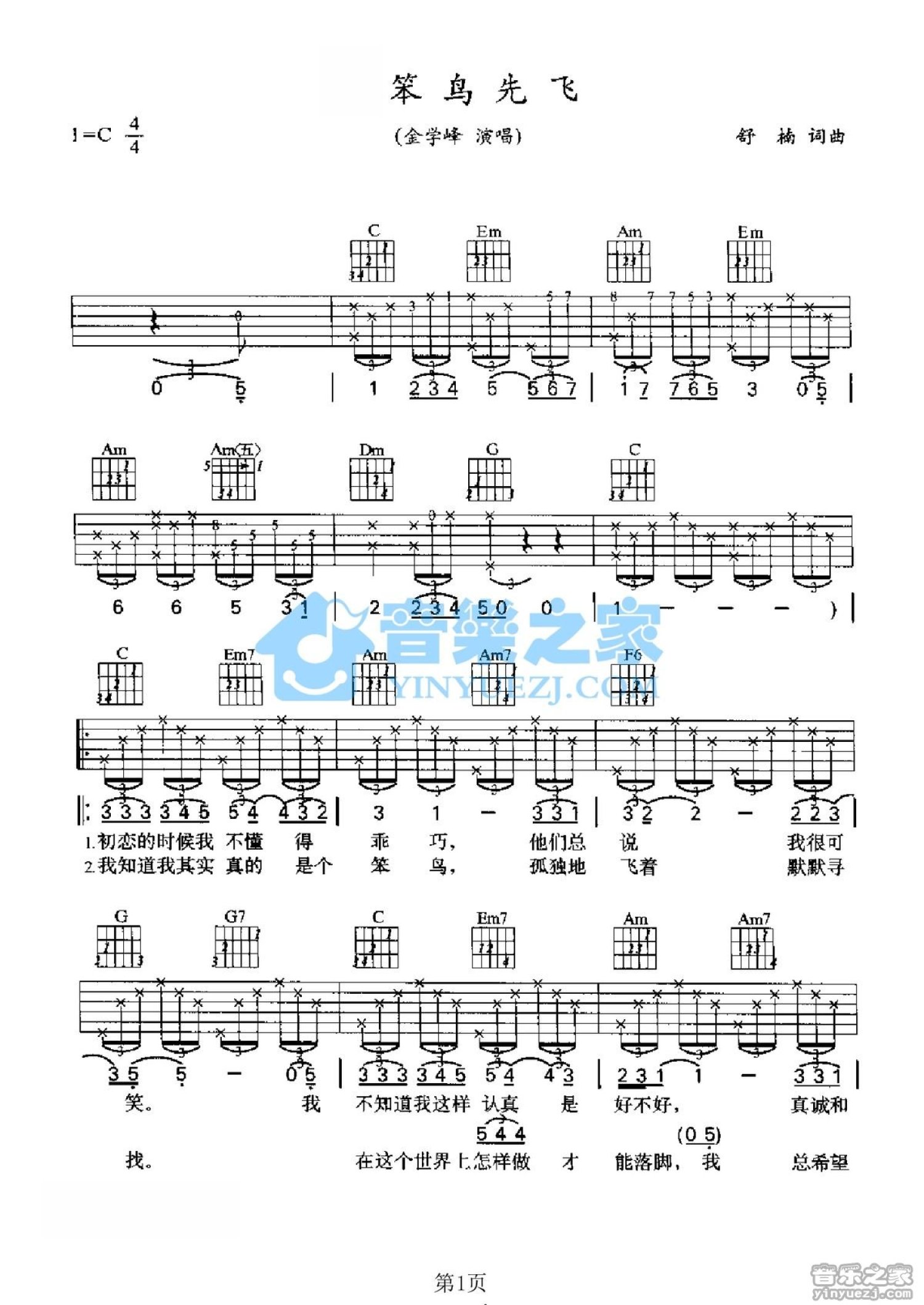 曲谱介绍: C调版金学峰《笨鸟先飞》吉他弹唱六线谱