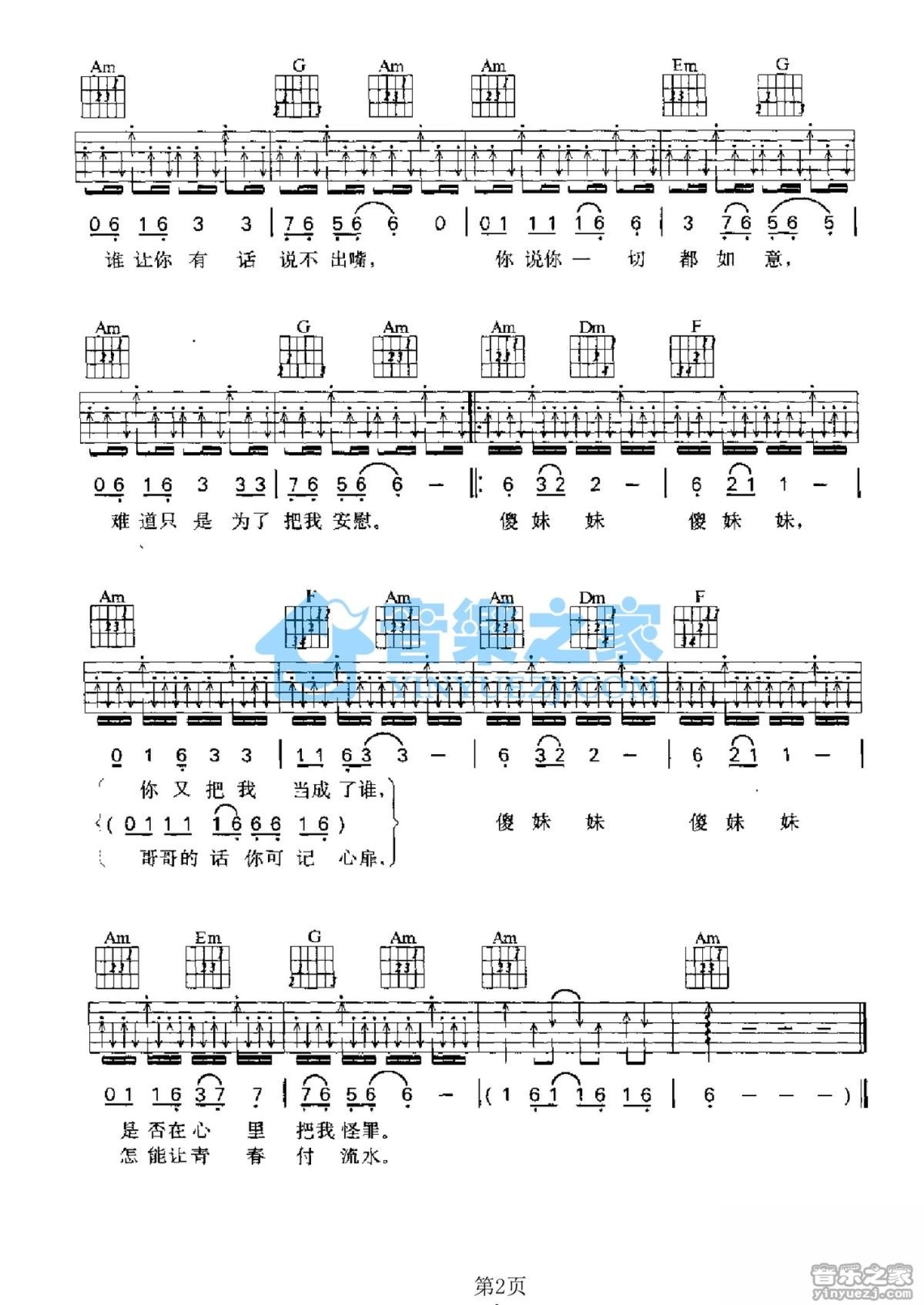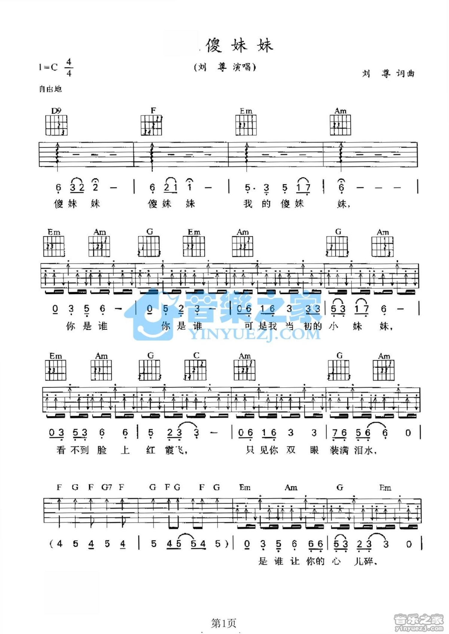 曲谱介绍: C调版刘尊《傻妹妹》吉他弹唱六线谱