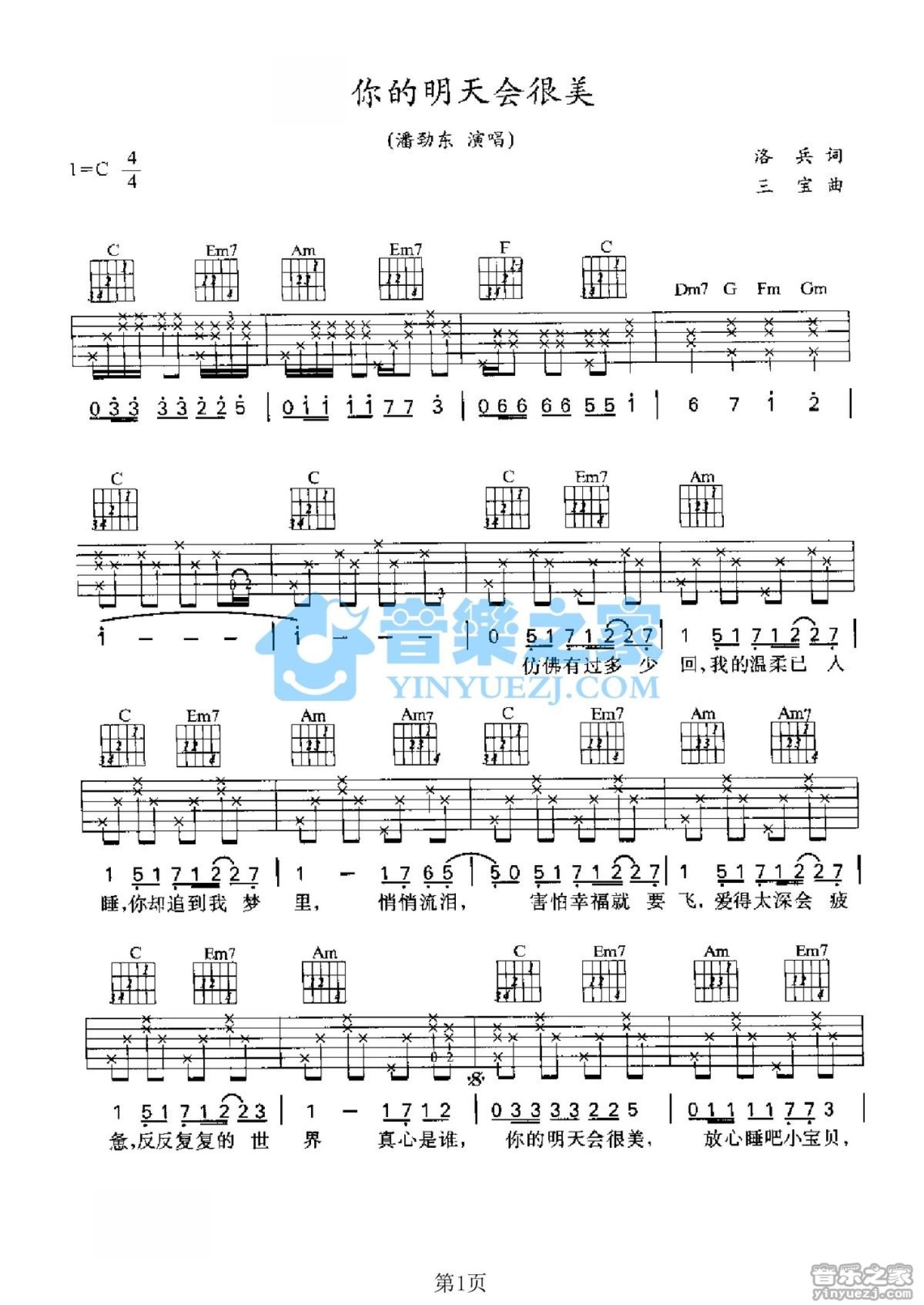 曲谱介绍: C调版潘劲东《你的明天会很美》吉他弹唱六线谱
