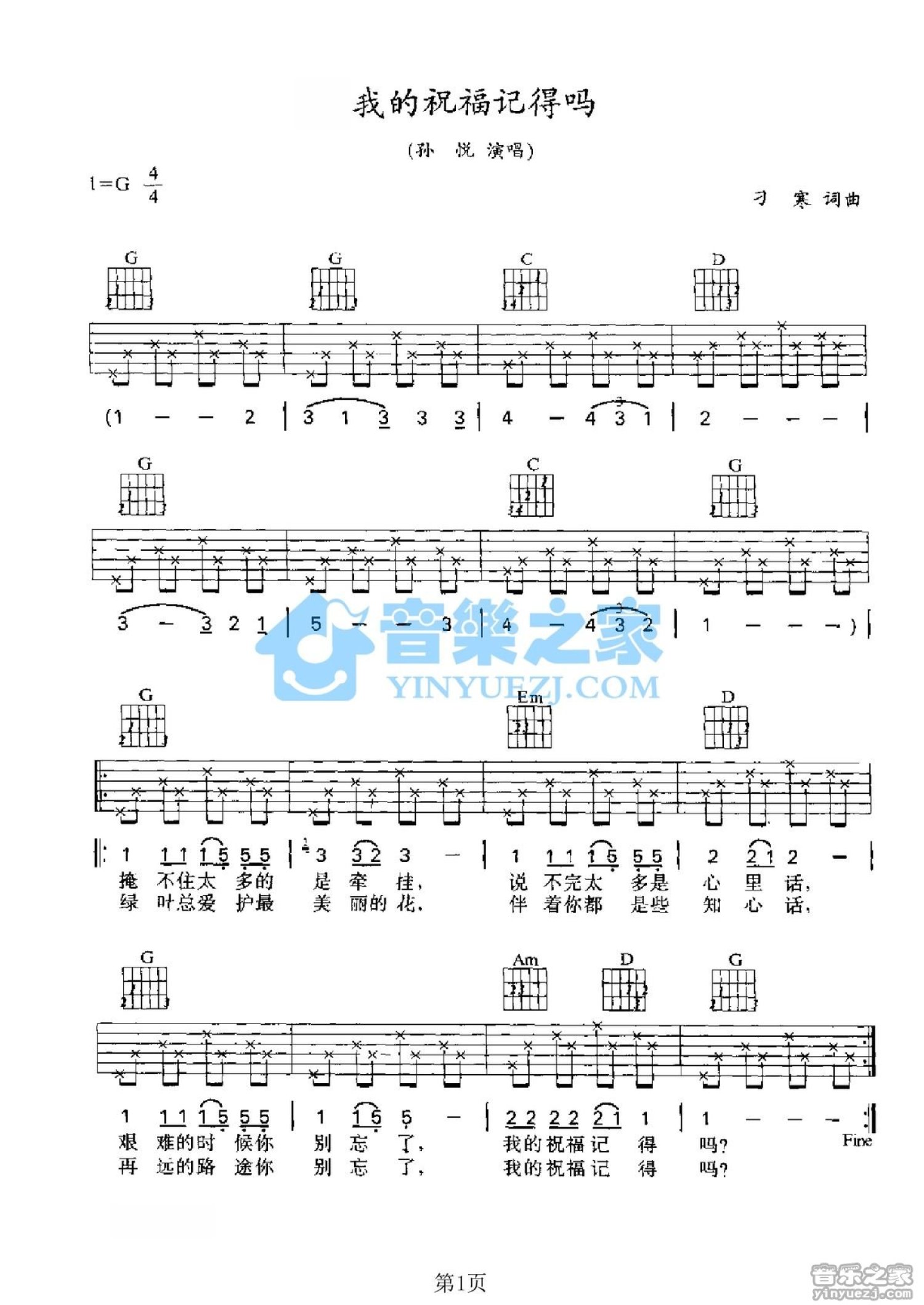 我的祝福你记得吗吉他谱 - 孙悦 - G调吉他弹唱谱