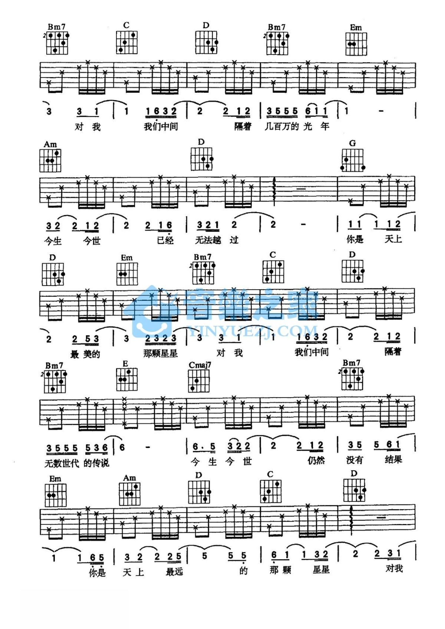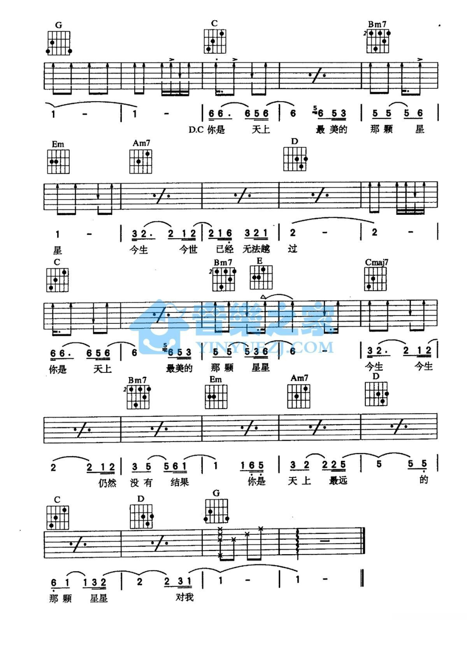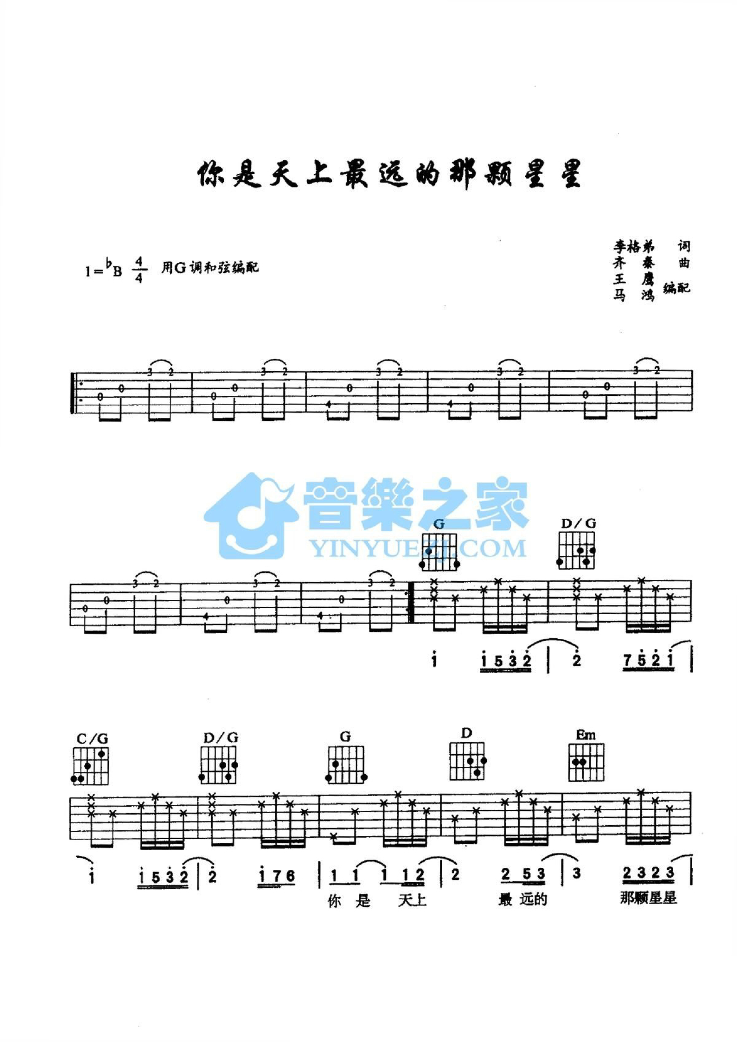 曲谱介绍: G调版齐秦《你是天上最远的那颗星星》吉他弹唱六线谱