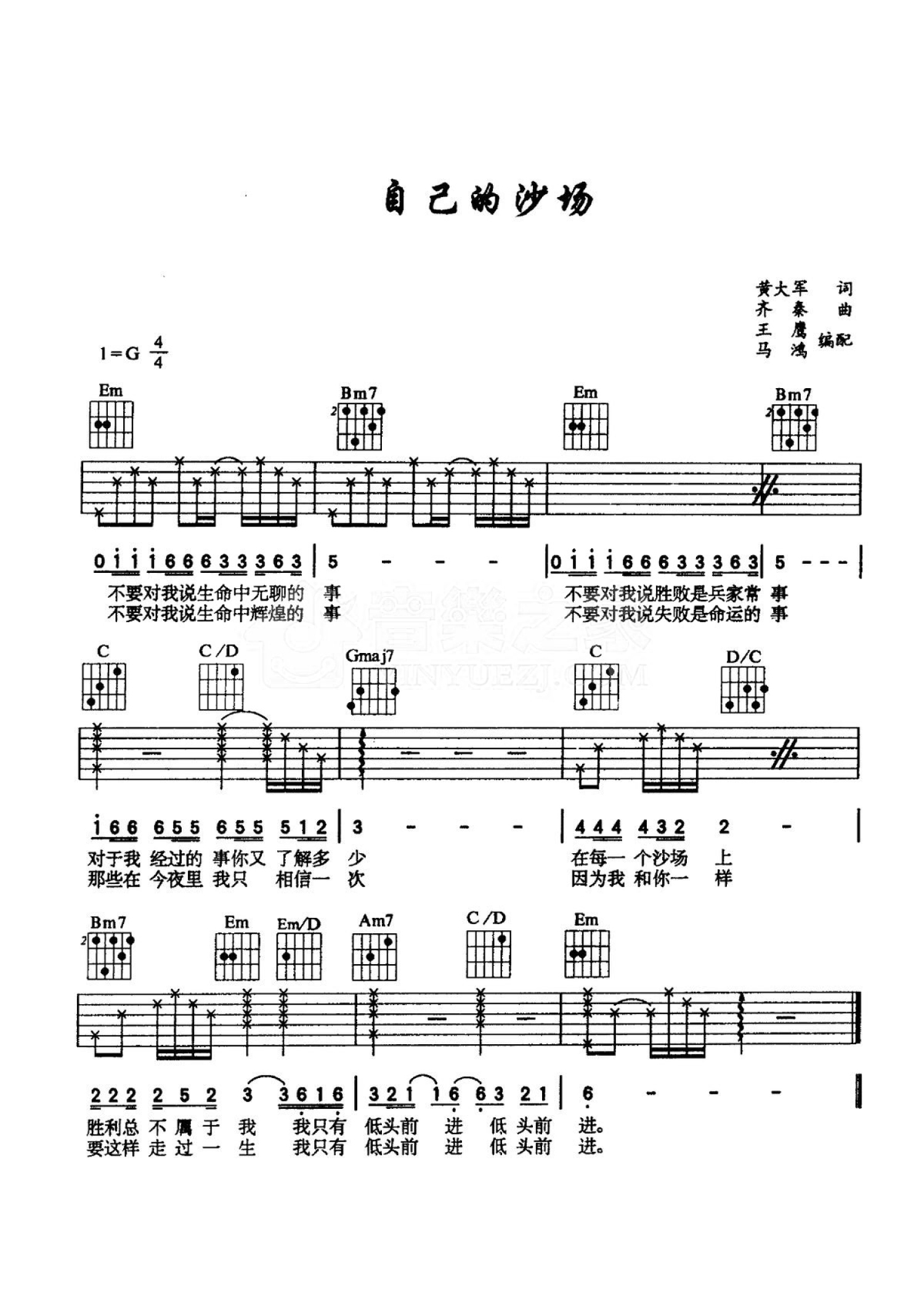 曲谱介绍: G调版齐秦《自己的沙场》吉他弹唱六线谱