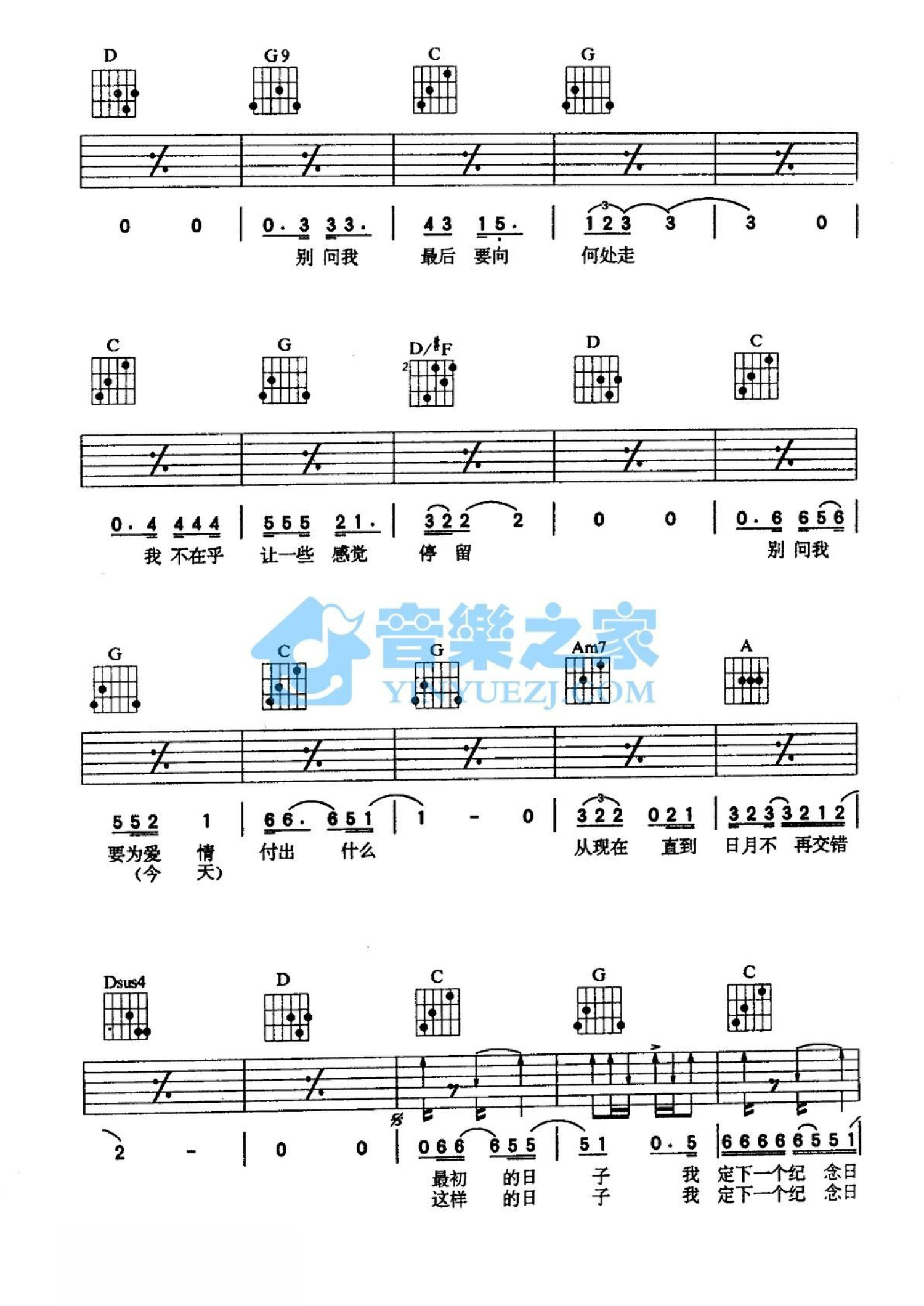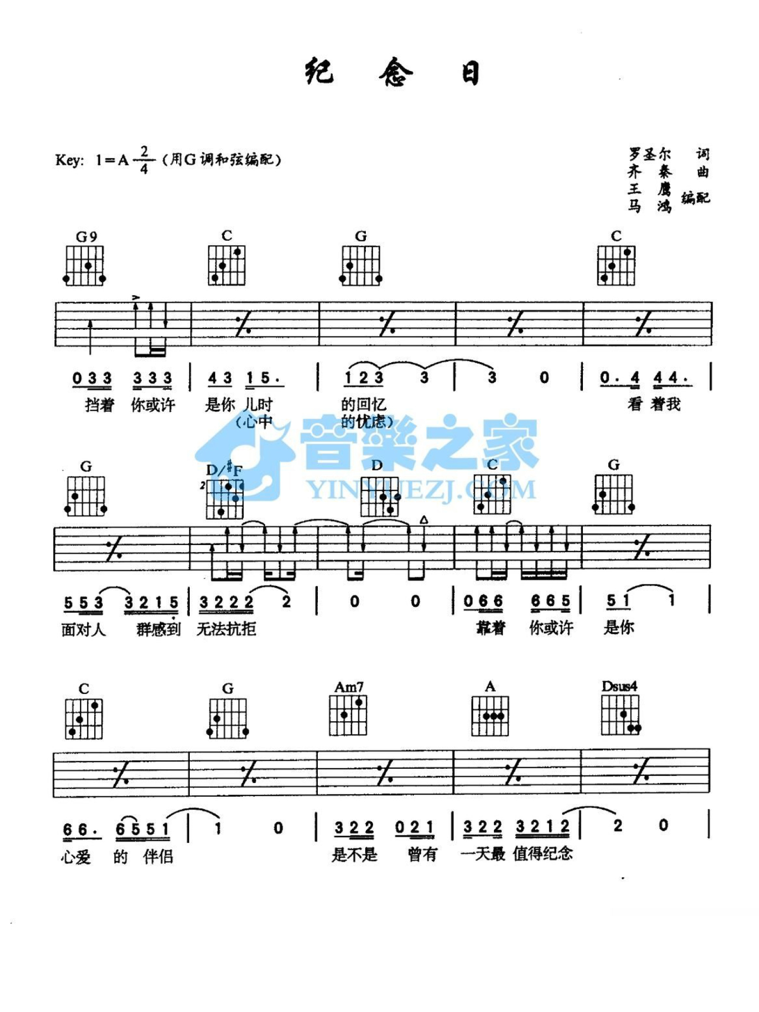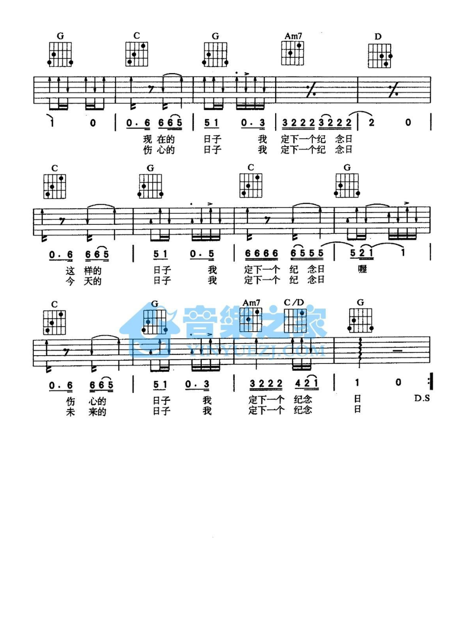 曲谱介绍: G调版《纪念日》吉他弹唱六线谱