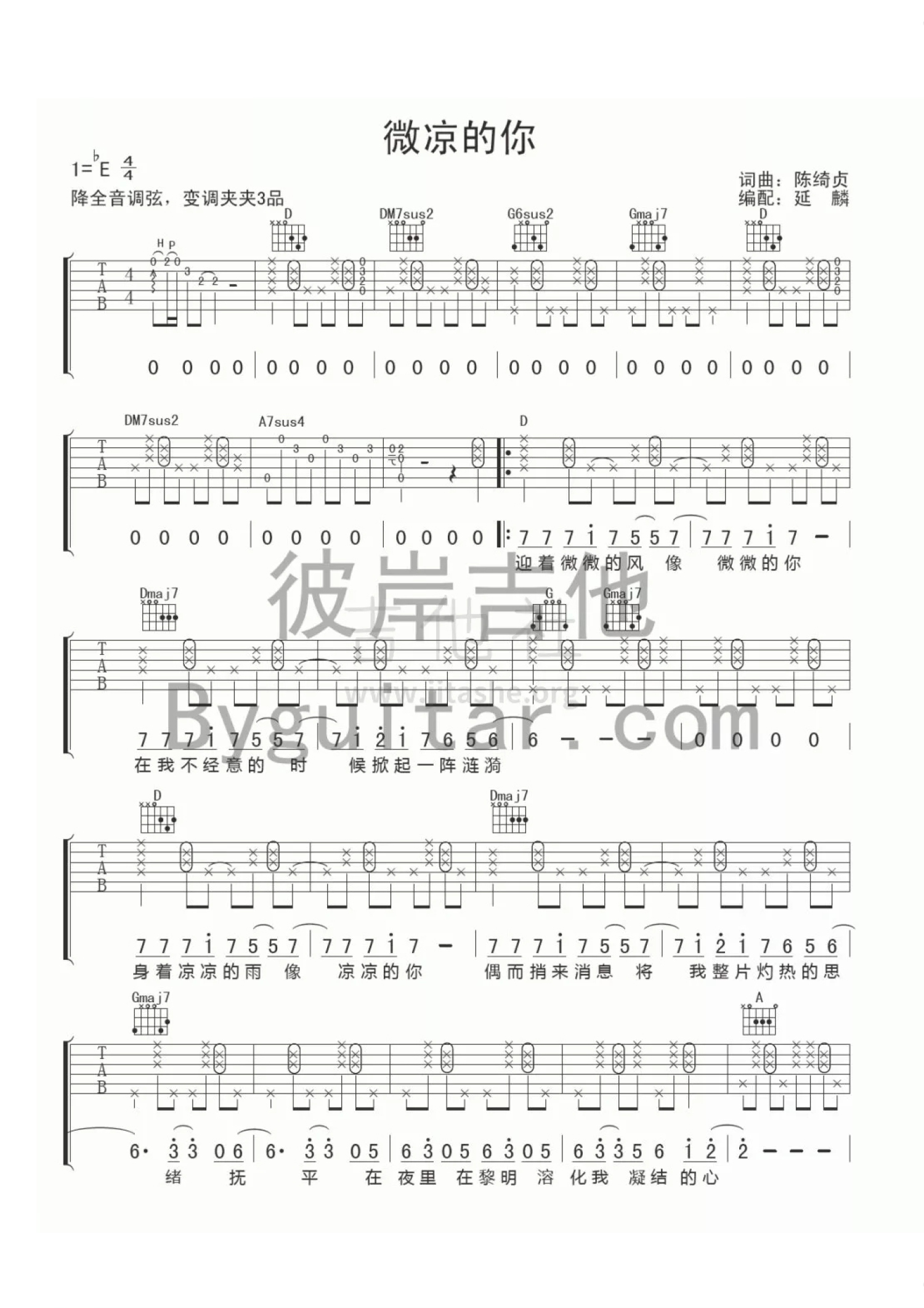 曲谱介绍: 陈绮贞的一首早期创作的民谣歌曲,微凉的你吉他谱。曲谱原调是降E调,需要降全音调弦,Capo3品。微凉的你吉他弹唱,歌曲旋律舒展、节奏轻松,散发着清新自然的气息。
