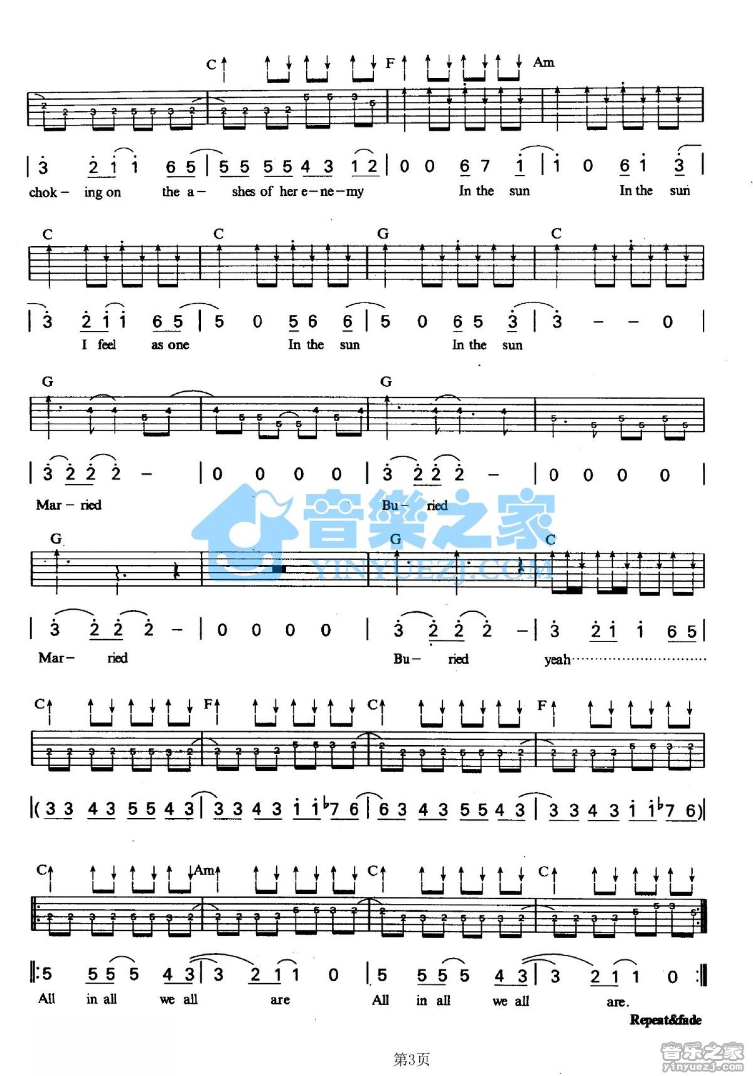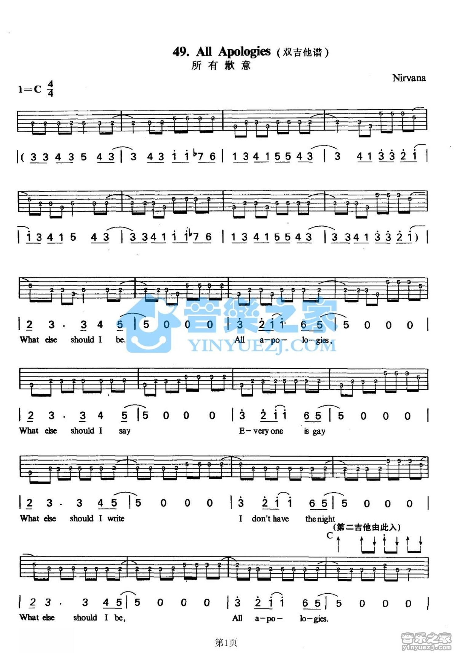 曲谱介绍: C调版Nirvana《AllApologies》吉他弹唱六线谱