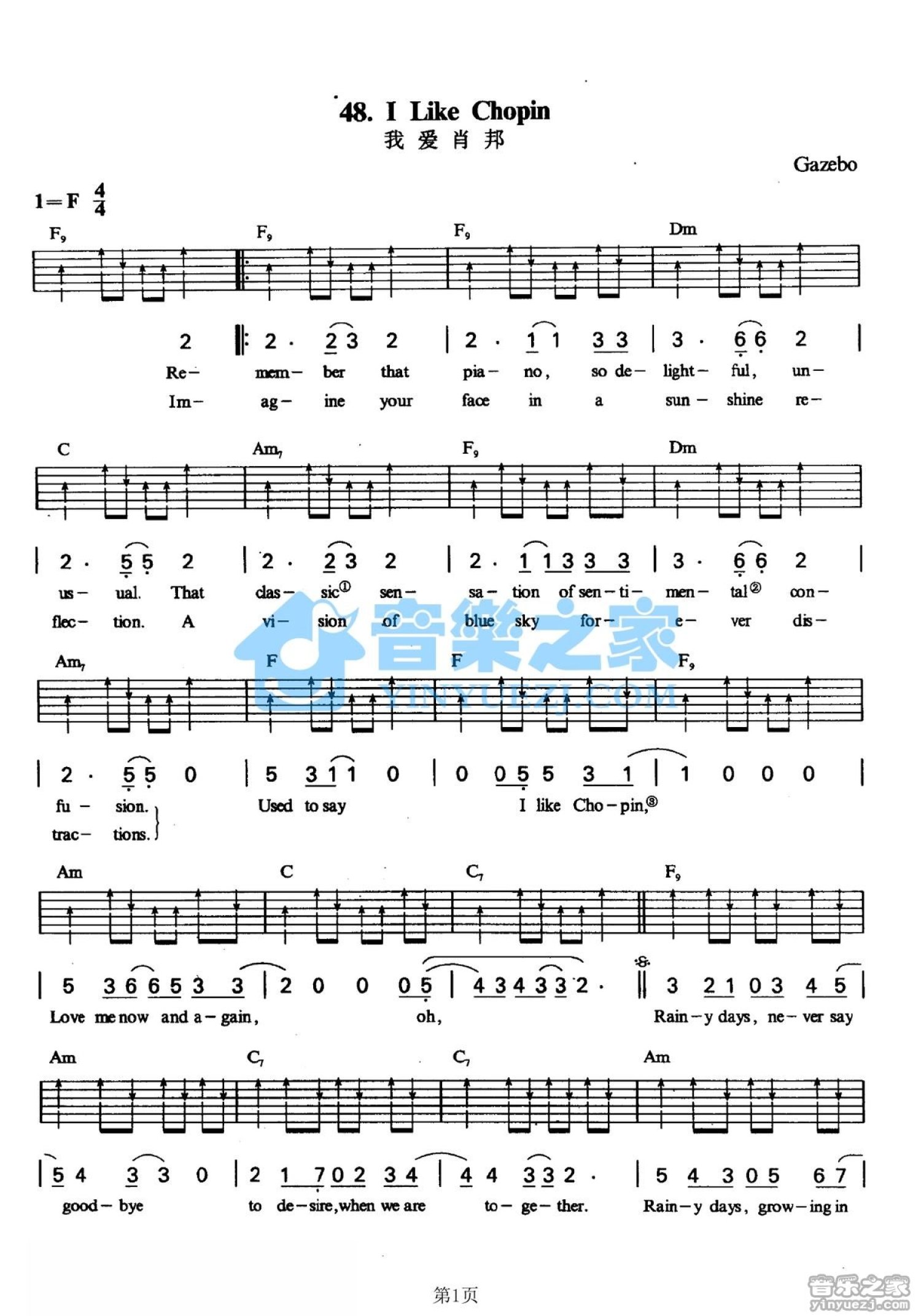 曲谱介绍: F调版Gazebo《ILikeChopin》吉他弹唱六线谱