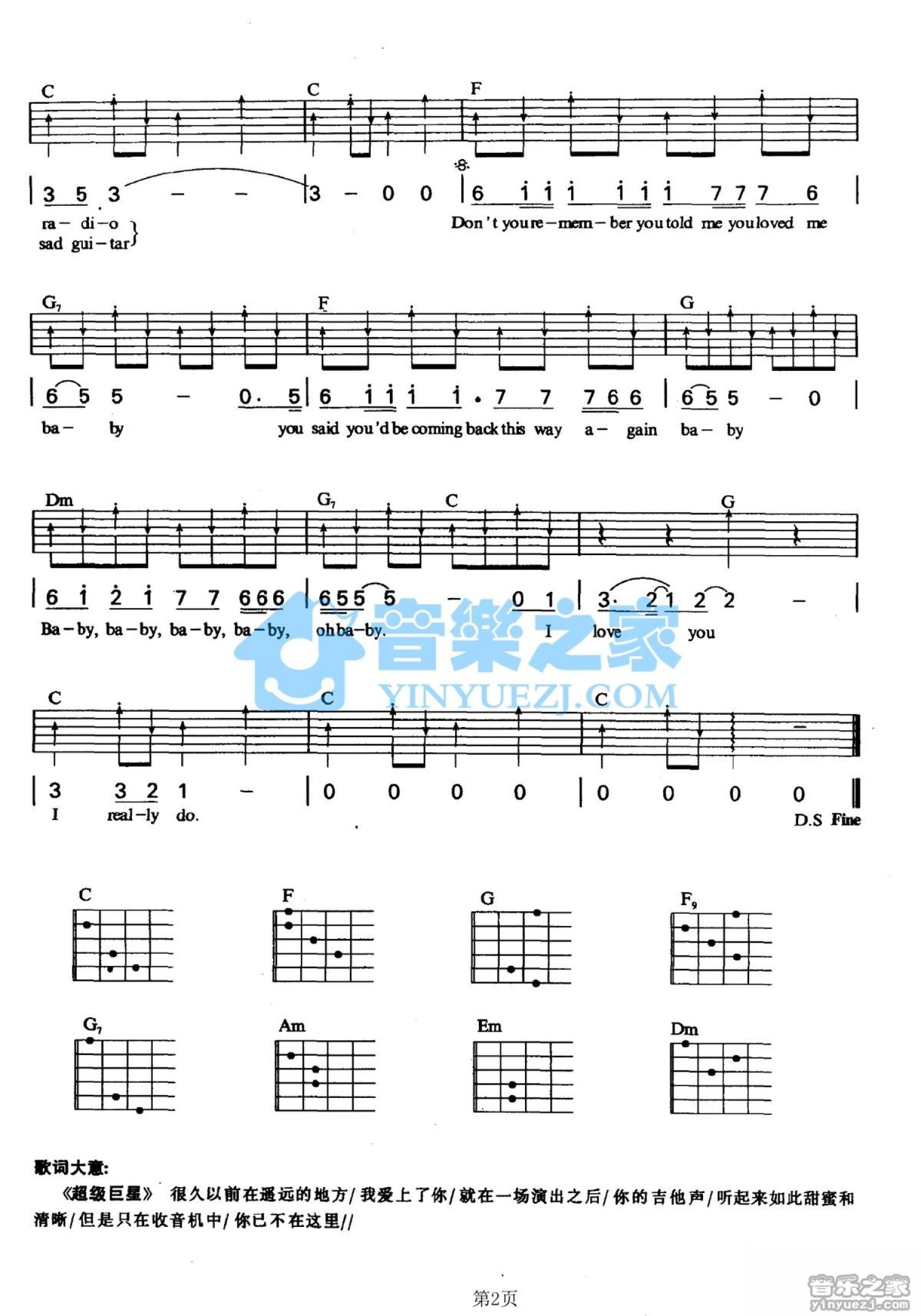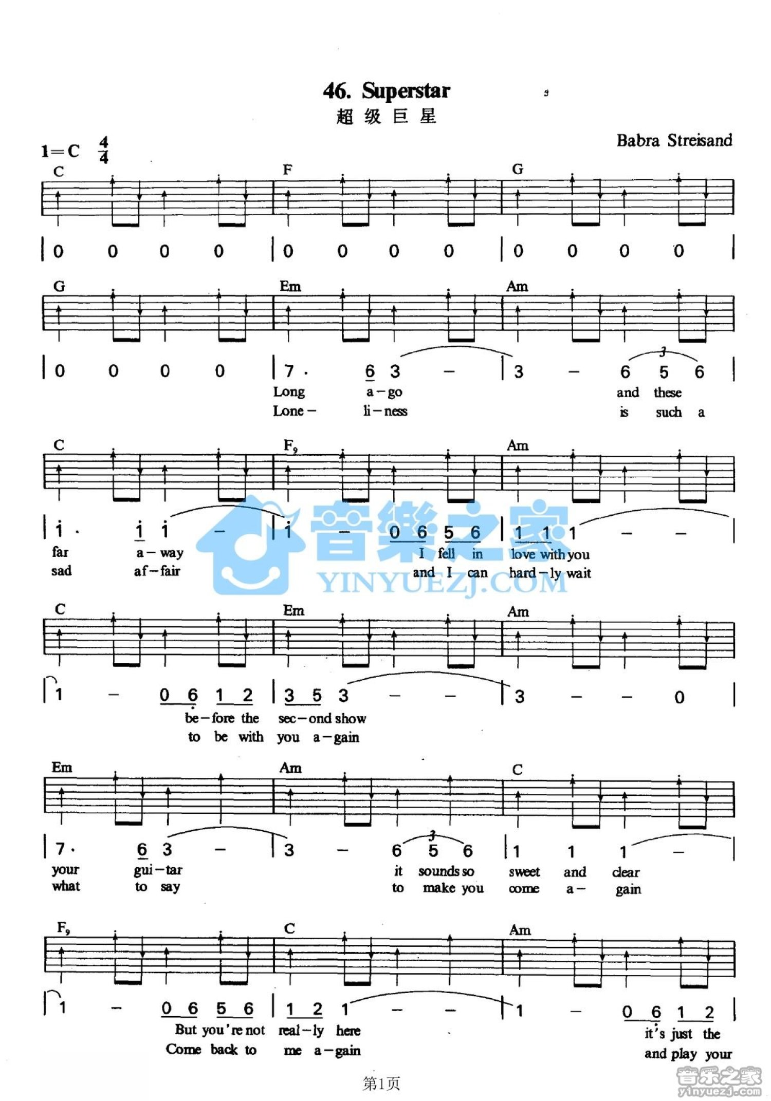 曲谱介绍: C调版BarbraStreisand《Superstar》吉他弹唱六线谱