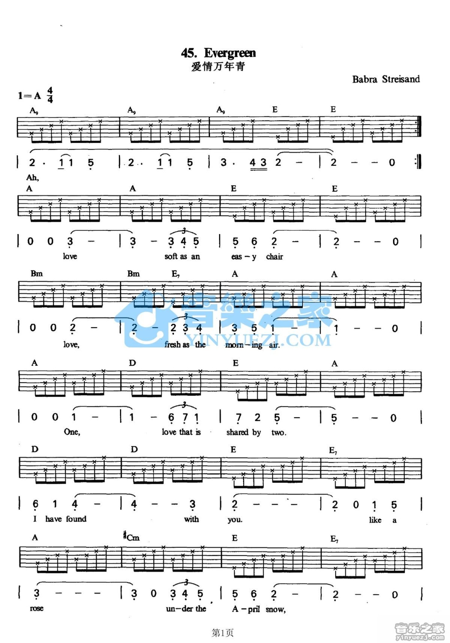 曲谱介绍: A调版BarbraStreisand《Evergreen》吉他弹唱六线谱