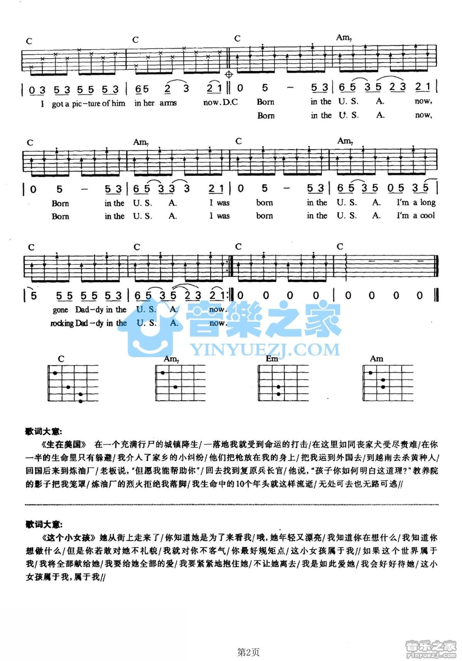 曲谱介绍: C调版《BornintheUSA》吉他弹唱六线谱