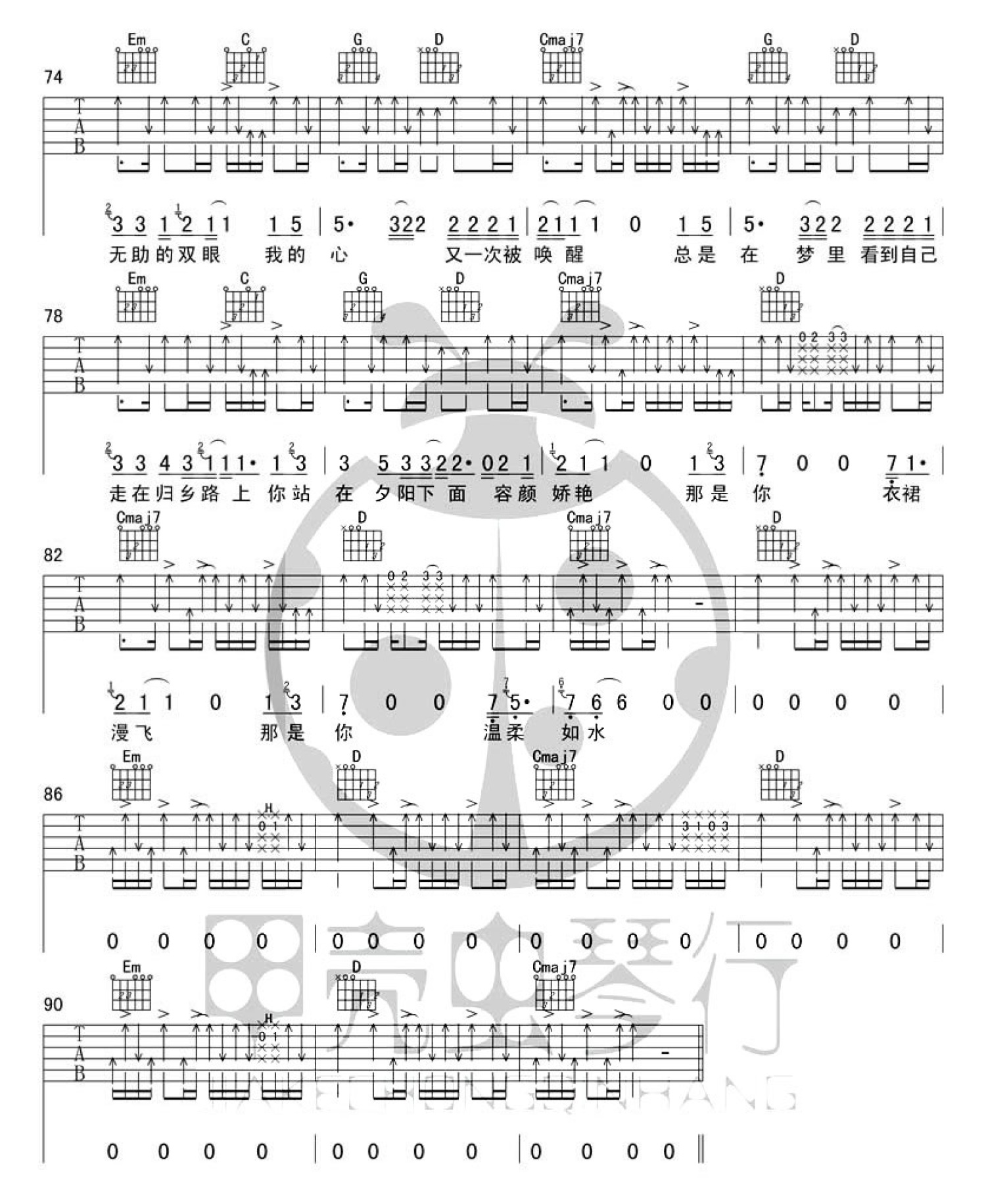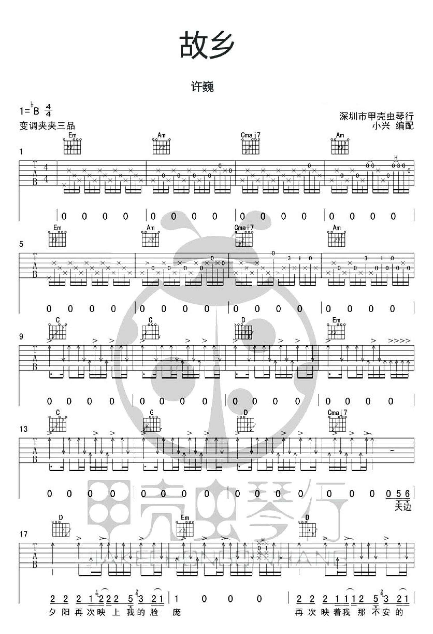 曲谱介绍: 许巍一首旋律优美节奏明快的歌曲,经典的吉他弹唱故乡吉他谱,曲谱在编配上在扫弦方面保留了原版的风格,故乡吉他六线谱,变调夹夹3品,